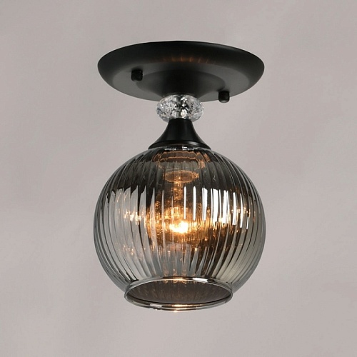 Металлическое основание светильника окрашено в черный цвет. Стеклянный плафон отлит в сложную форму и гальванизирован в дымчатый цвет. У основания светильник декорирован прозрачным хрусталем.