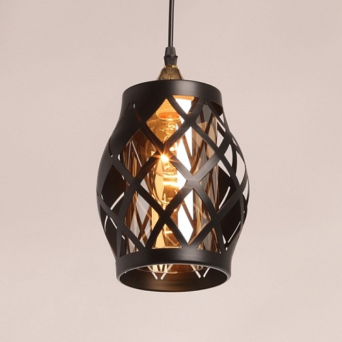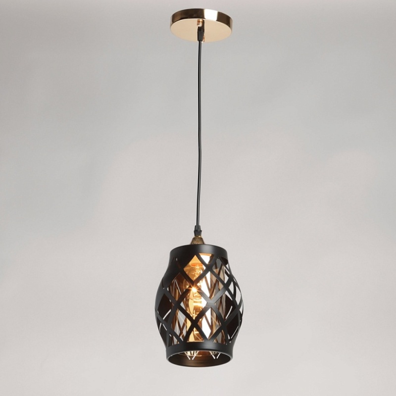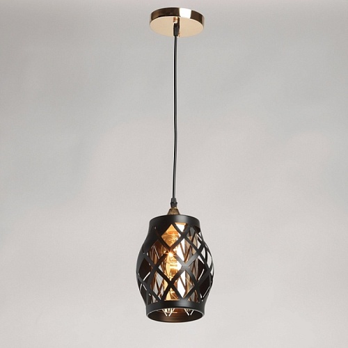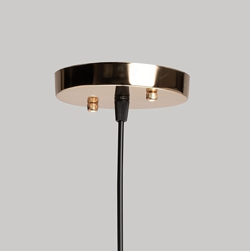Потолочная чаша и держатель плафона выполнены из металла и гальванизированы в цвет золота. Металлический плафон окрашен в черный цвет. Внутренний стеклянный плафон гальванизирован в цвет шампань.