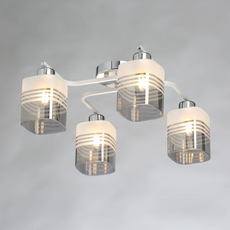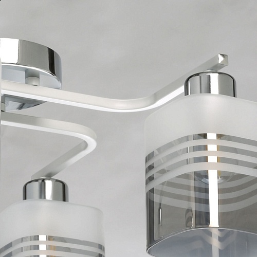 Металлическое основание потолочного светильника окрашено в белый цвет. Отдельные элементы гальванизированы в цвет хрома. Стеклянные плафоны гальванизированы в дымчатый цвет и окрашены в белый цвет в виде параллельных полос