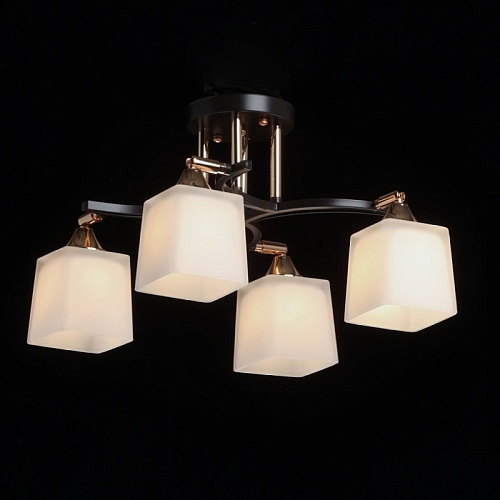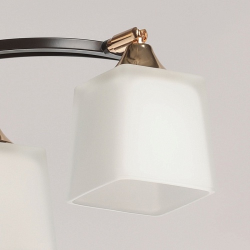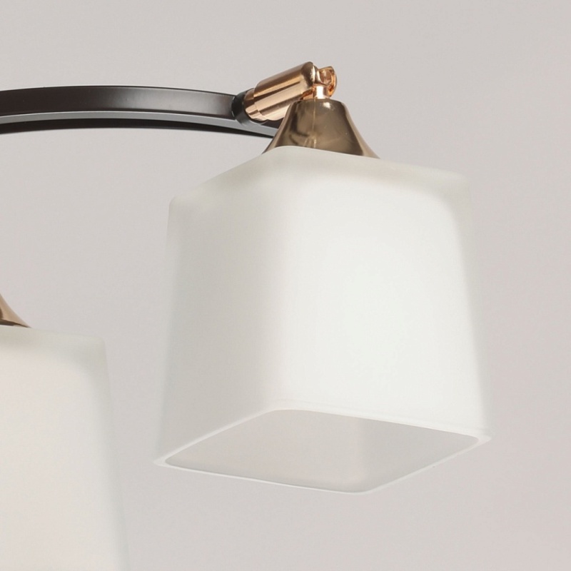 Металлическое основание потолочной люстры окрашено в цвет кофе. Отдельные элементы основания гальванизированы в цвет золота. Стеклянные плафоны отлиты в оригинальную форму и окрашены в белый цвет с внутренней стороны.