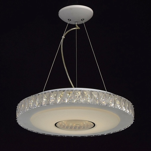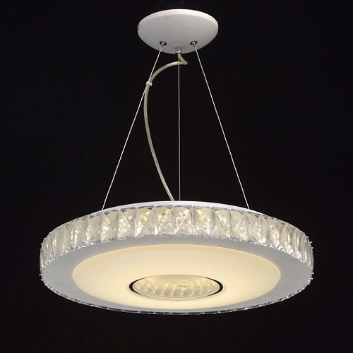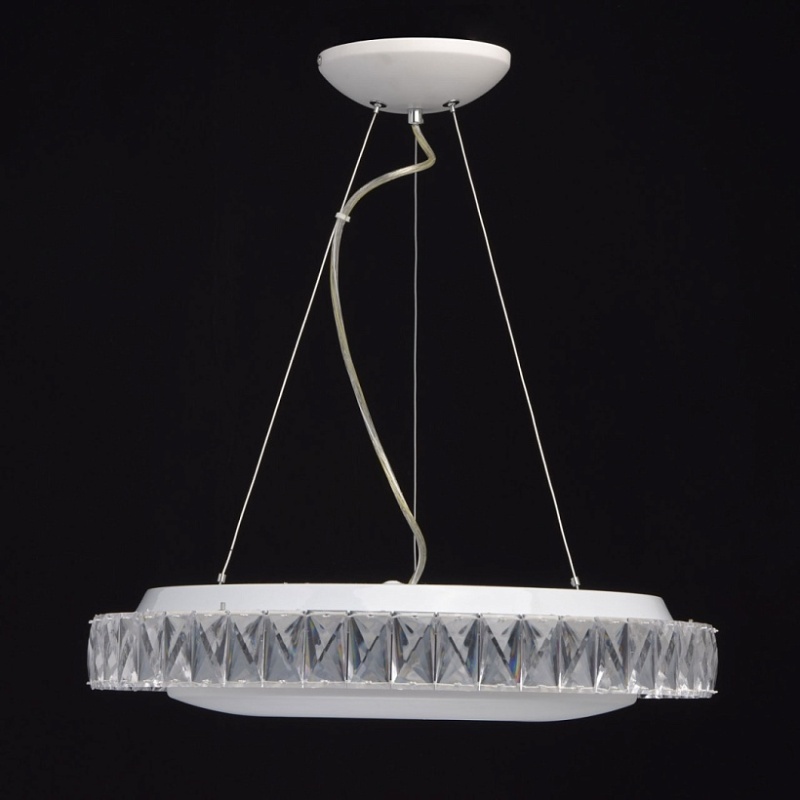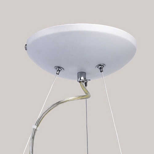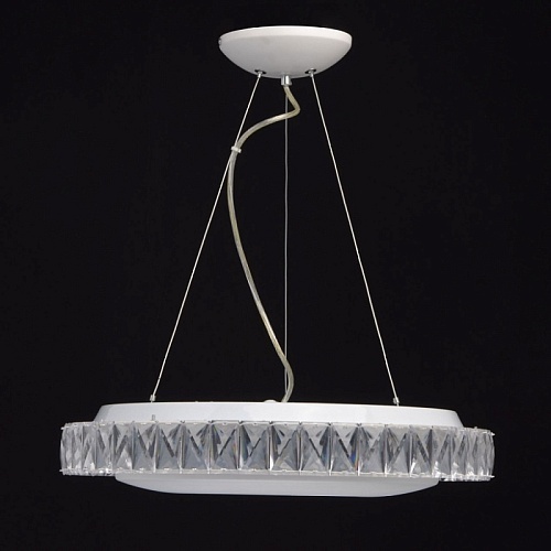Основание: металл, окрашено в белый цвет. Потолочная чаша: металл, обработка на токарном станке. Плафон: из акрила белого цвета. Декор: хрусталь.