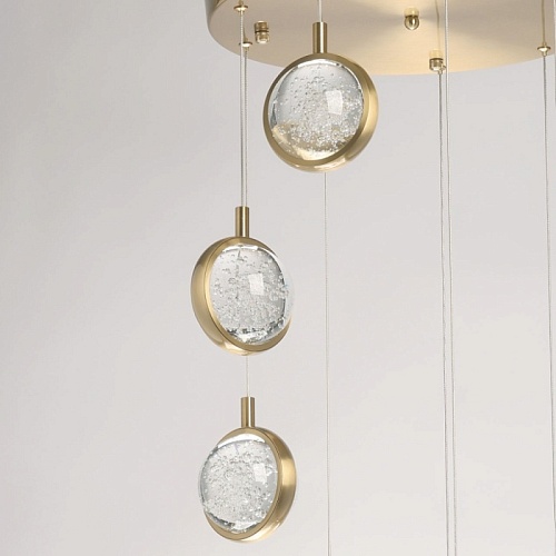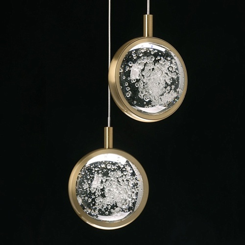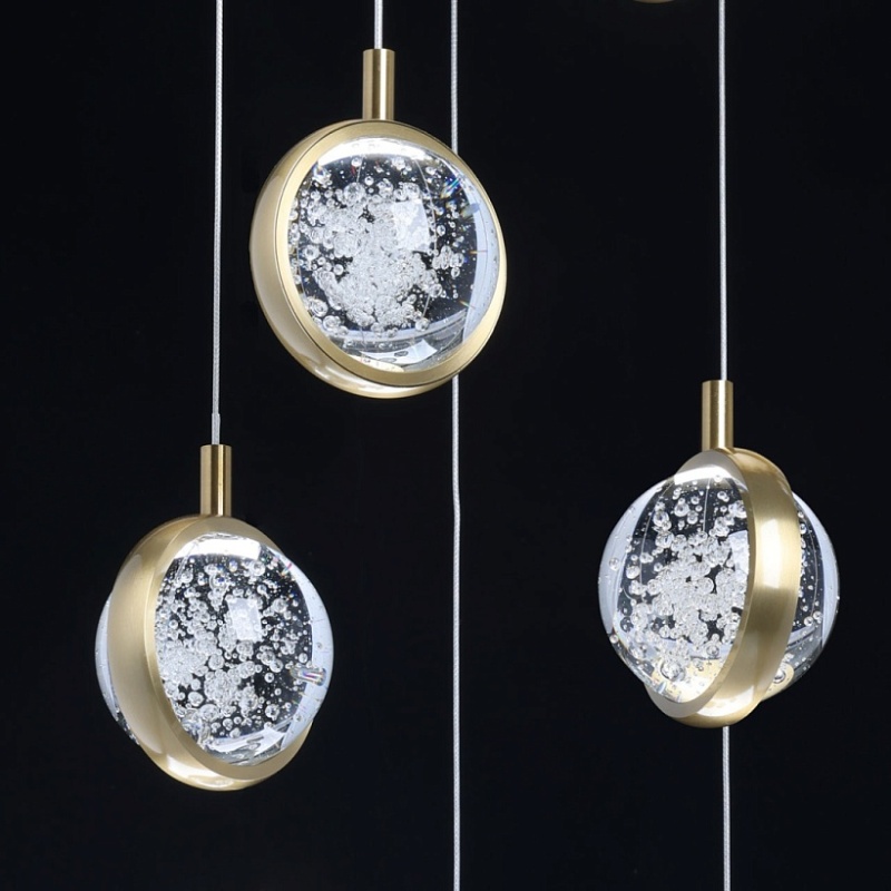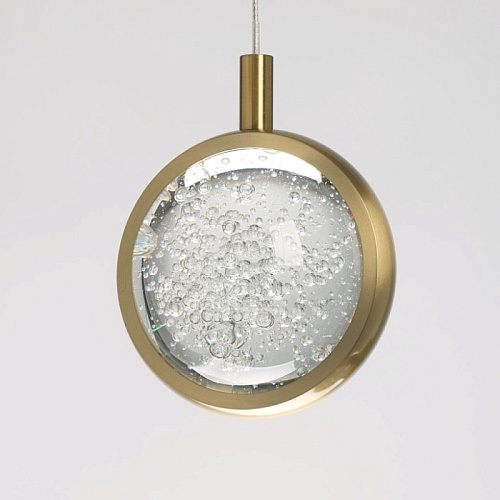 Основание светильника выполнено из сплава алюминия с цинком, обработано по технологии брашинга и гальванизировано в цвет медовой бронзы. Светодиодный источник света закрыт сферой из стекла с включениями пузырьков.