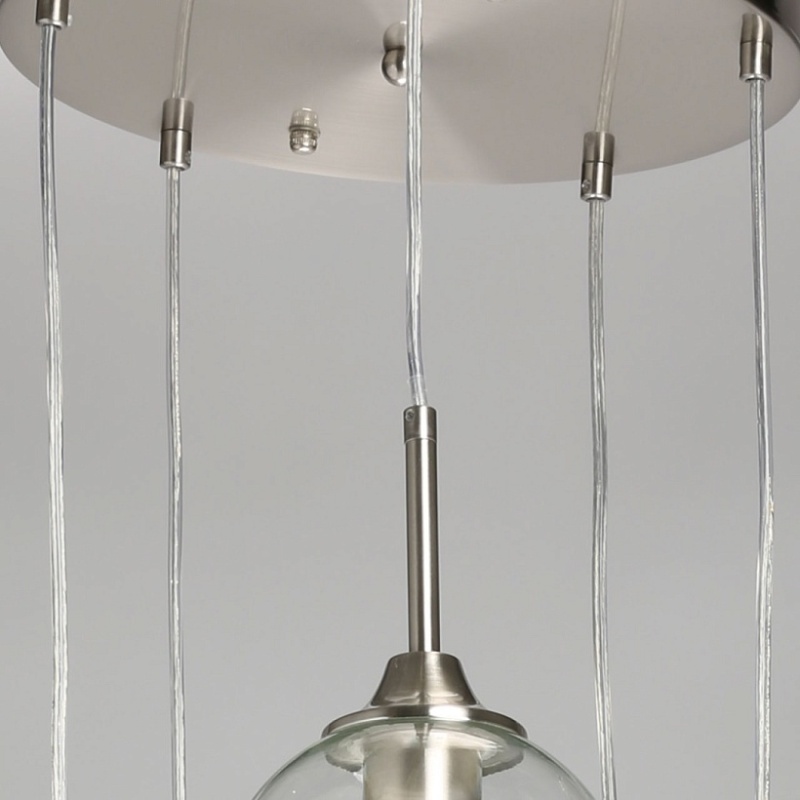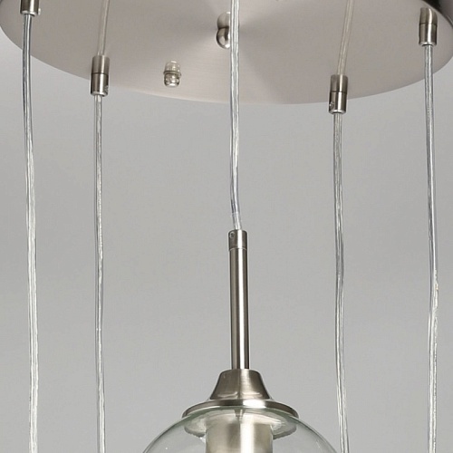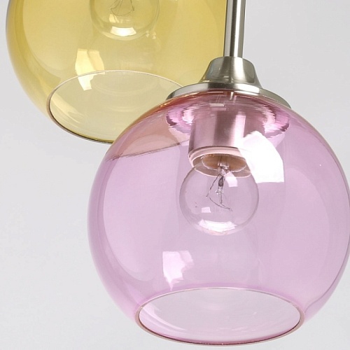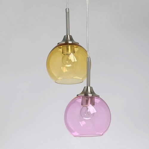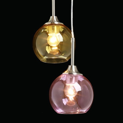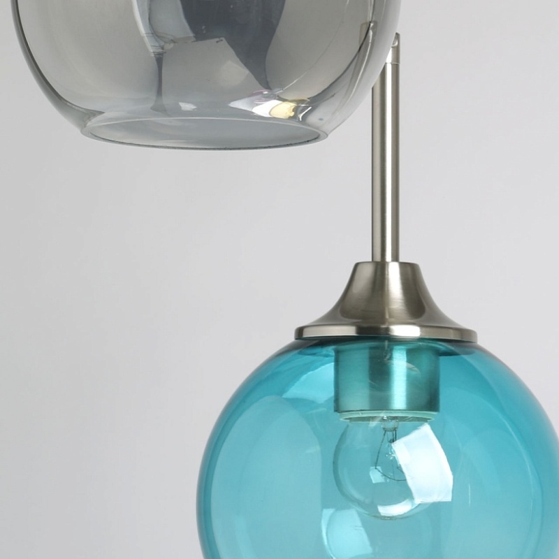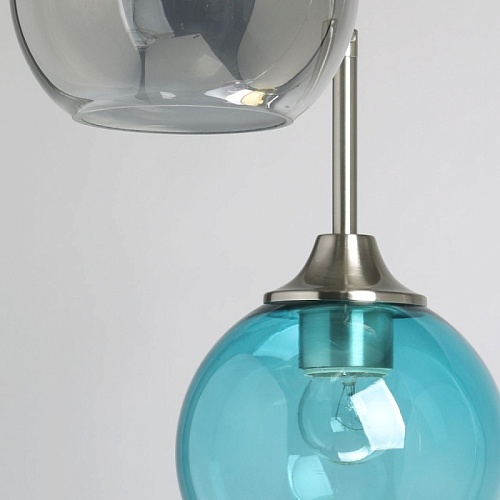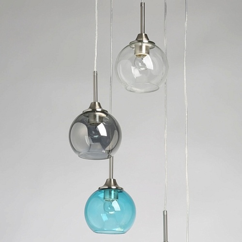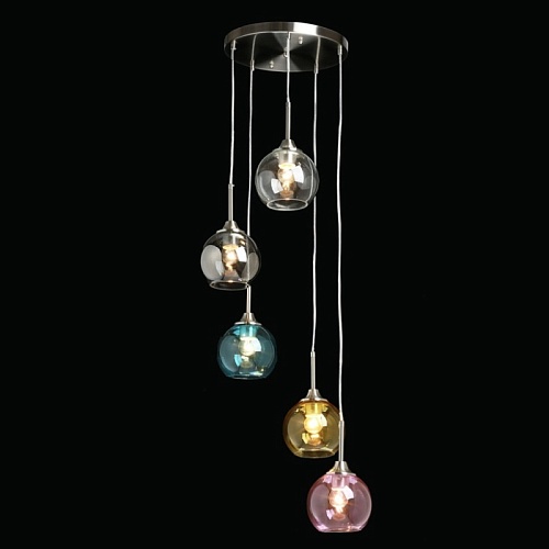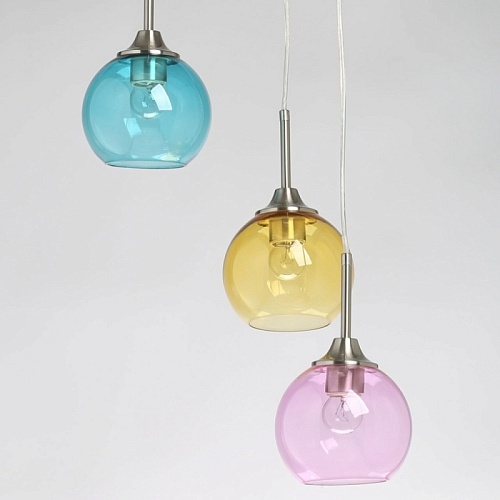Металлическое основание подвесной люстры гальванизировано в цвет никеля. Стеклянные плафоны выдуваются в форму и имеют разные оттенки: прозрачный, гальванизированный в дымчатый цвет и окрашенный в массе в синий, красный и желтый цвета.
