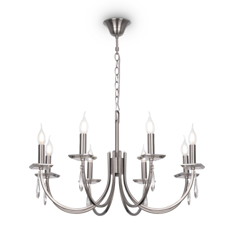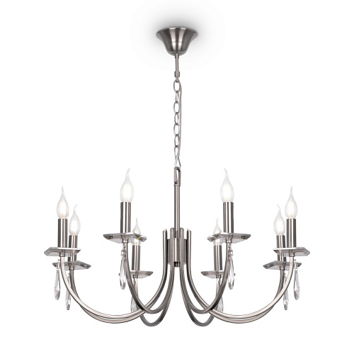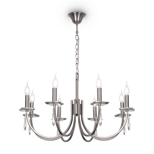Металлическая арматура в двух оттенках: латунь и никель. Классическая форма плафона в виде свечи. Торшер и настольная лампа имеют тканевые абажуры. Белые – для арматуры цвета никель, оттенка кремовый шампань – для латунной. Декор – прозрачные хрустальные подвесы каплевидной формы. Торшер с цоколем Е27, лампа, бра и люстры – Е14.