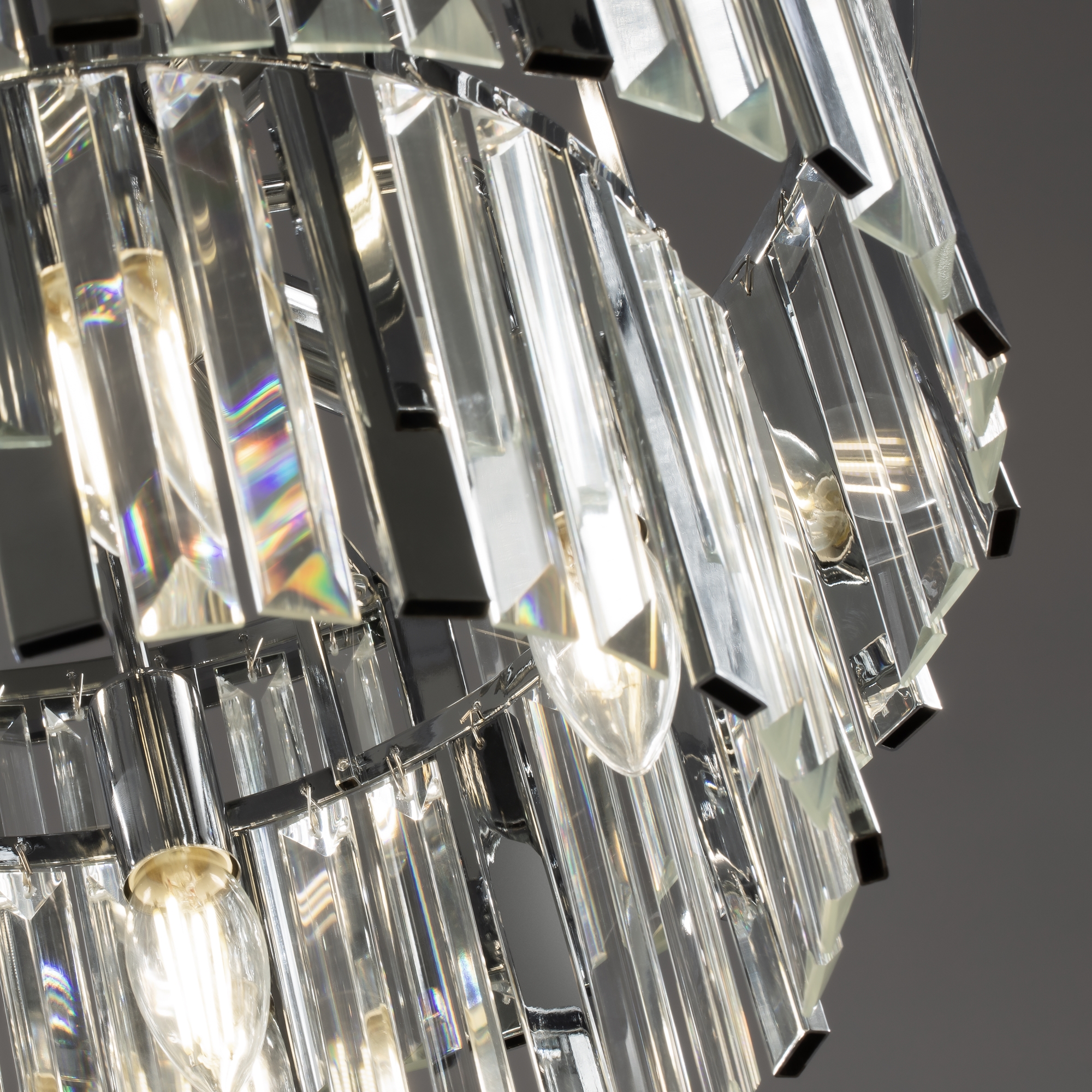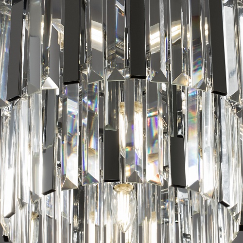 Арматура из металла. Оттенки – хром, золото. Многоярусный стеклянный декор прямоугольной вытянутой формы. В качестве источников света используются лампы с цоколем Е14.