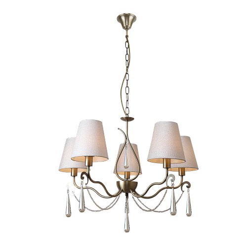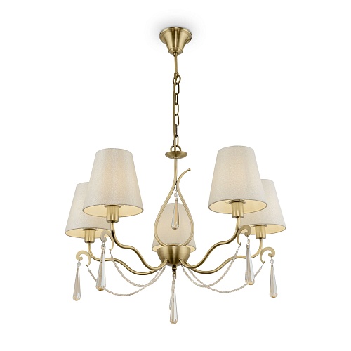 Металлическая арматура. Цвет – латунь. Абажуры из фактурной ткани белого цвета. Декор – хрустальные подвесы каплевидной формы. Одиночный подвес и торшер с цоколем Е27, лампа, бра и люстры – Е14.