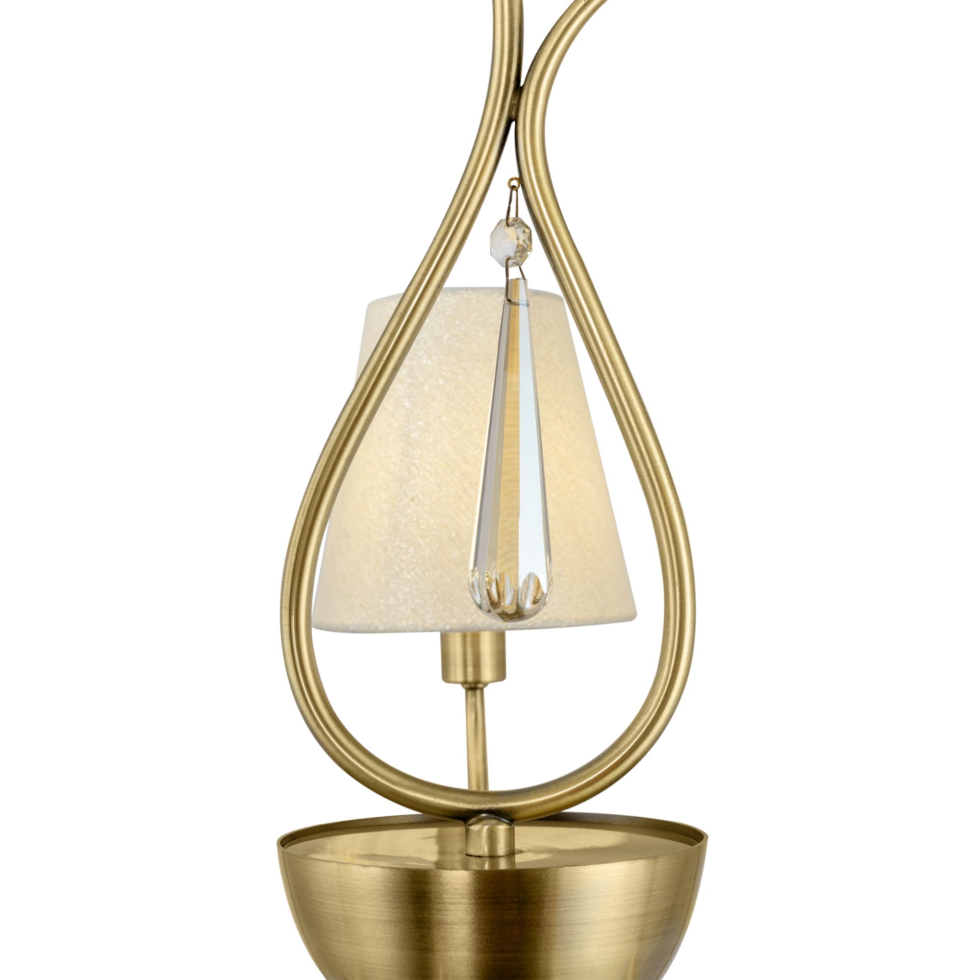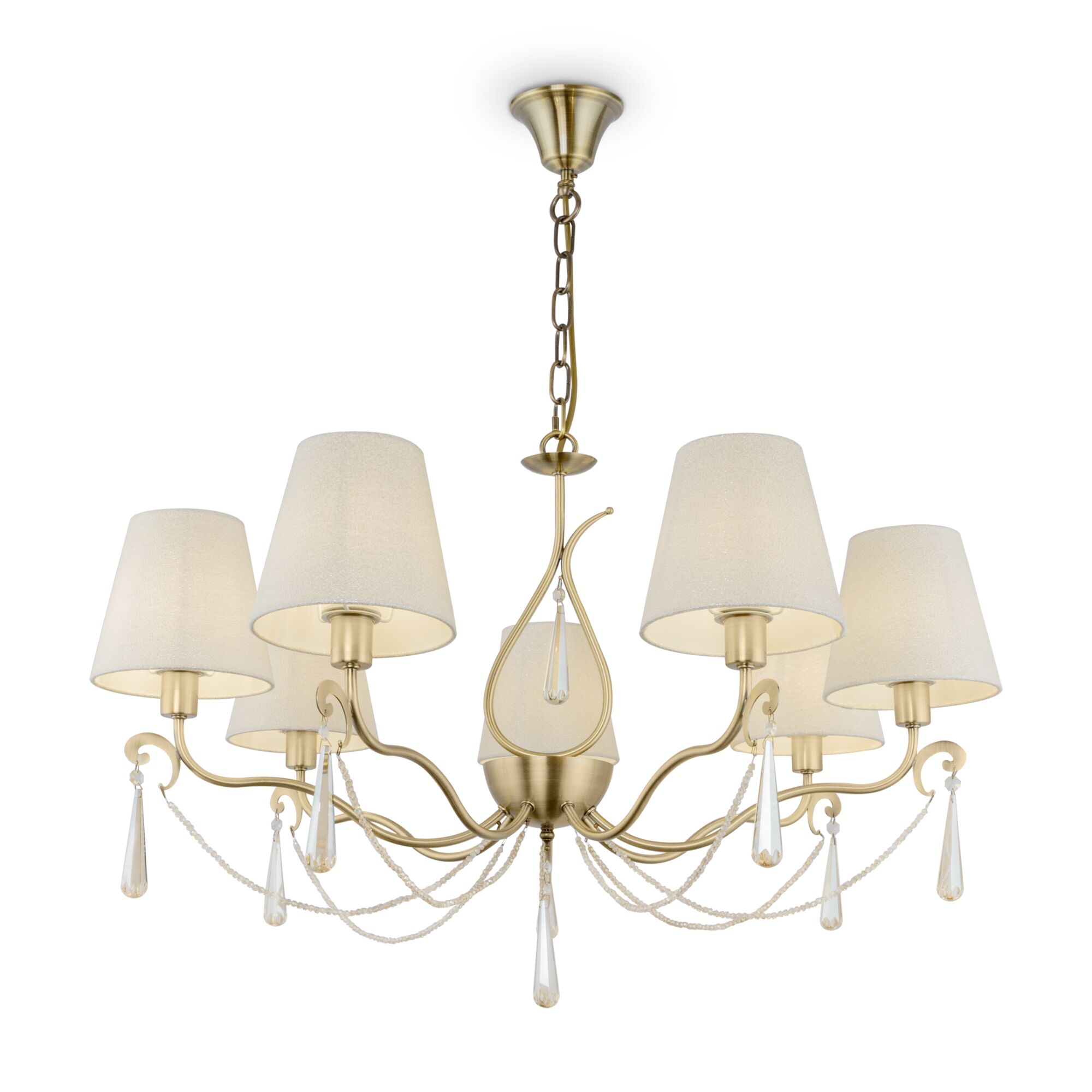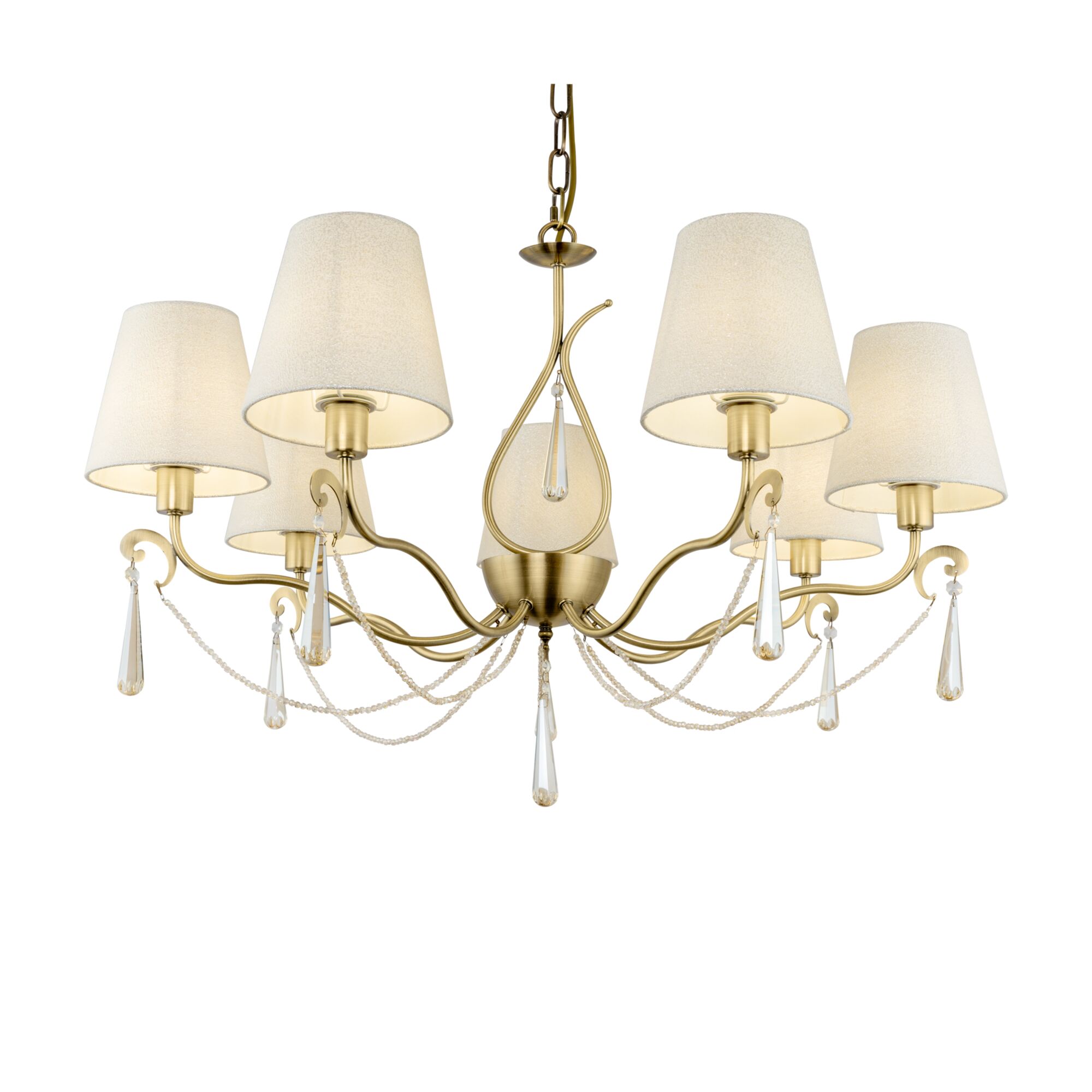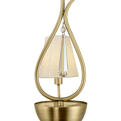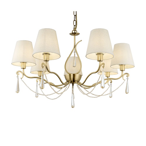 Металлическая арматура. Цвет – латунь. Абажуры из фактурной ткани белого цвета. Декор – хрустальные подвесы каплевидной формы. Одиночный подвес и торшер с цоколем Е27, лампа, бра и люстры – Е14.