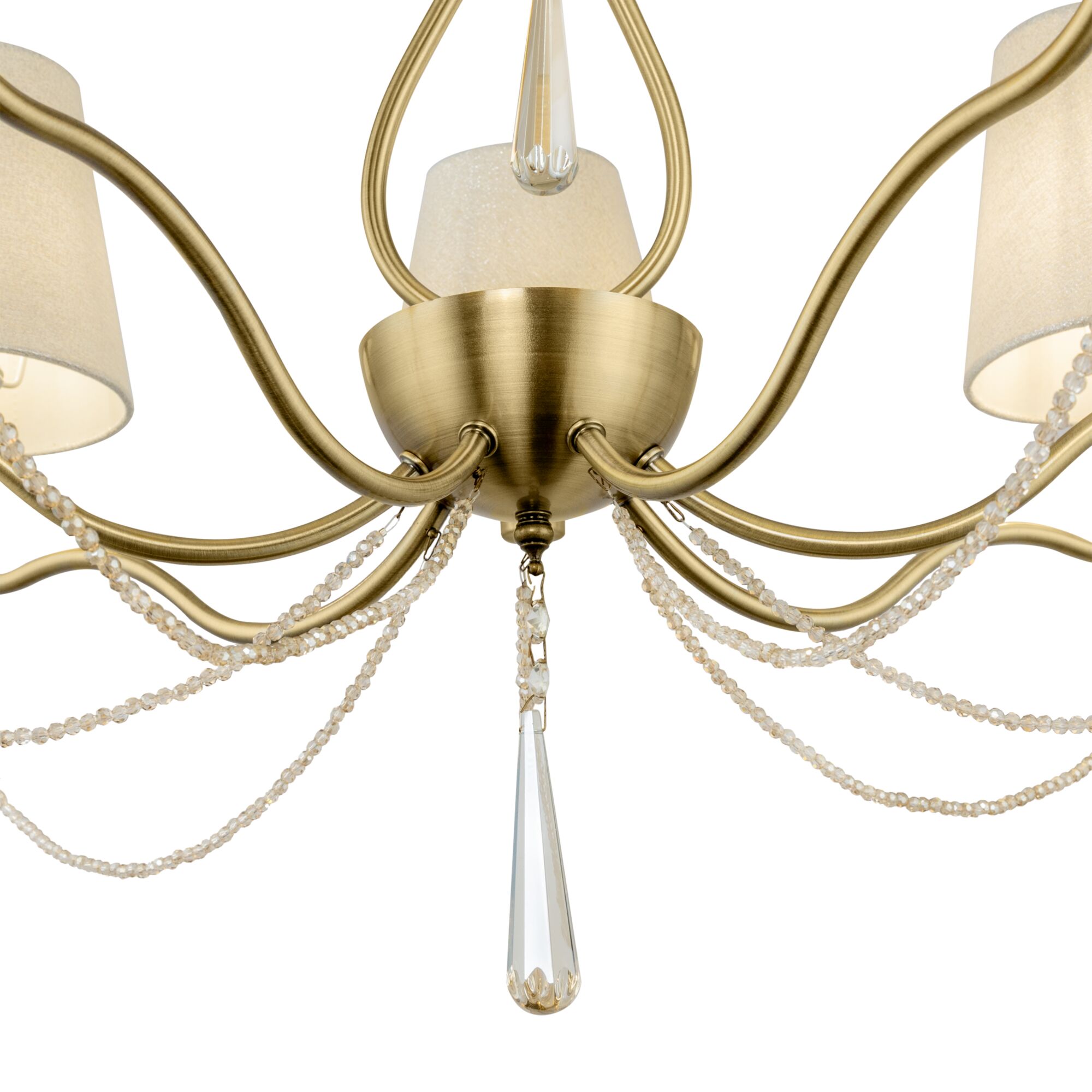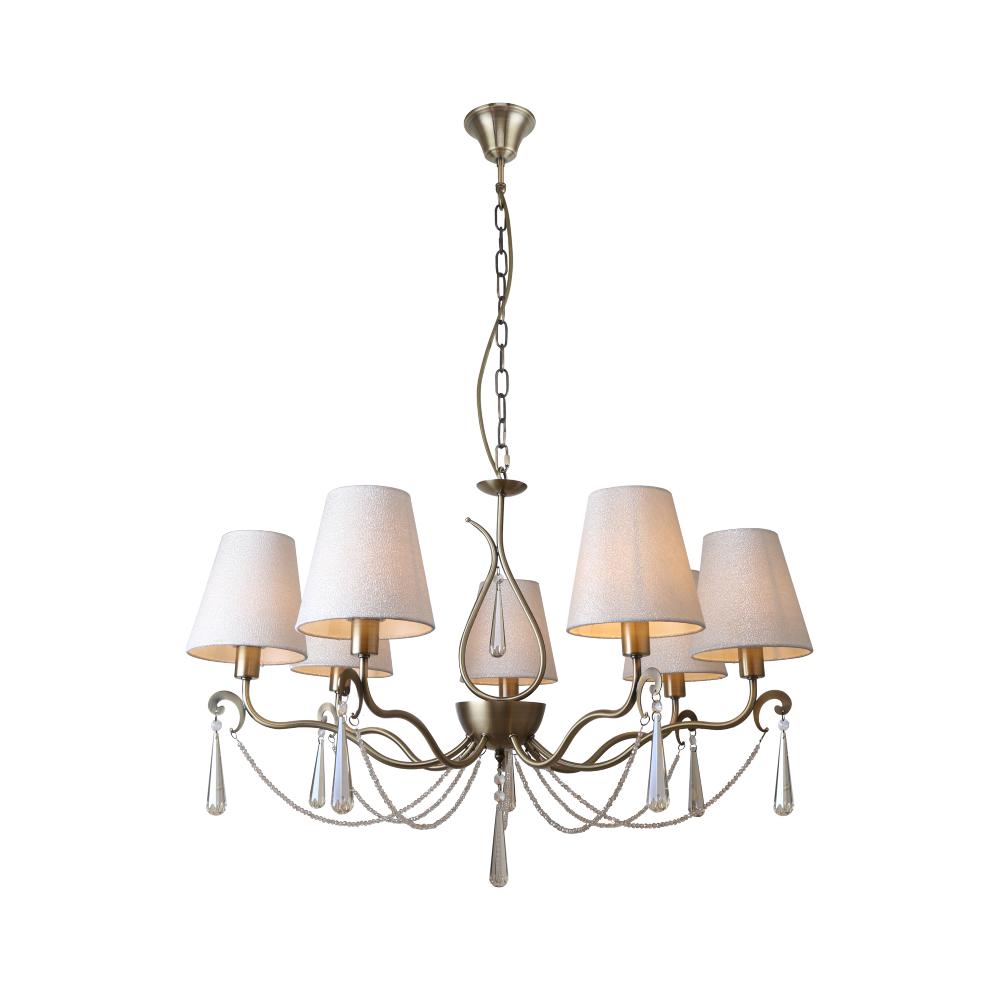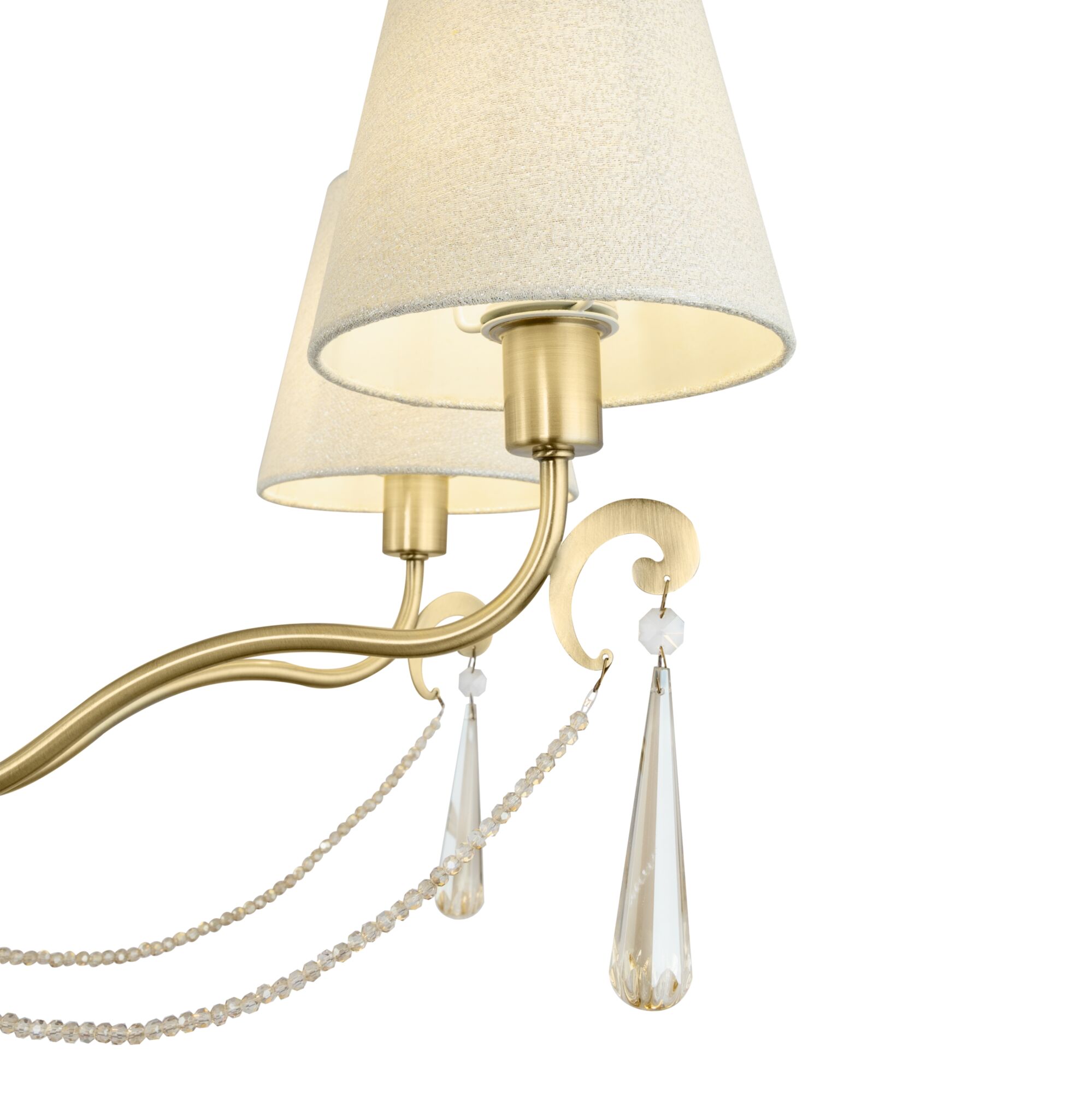 Металлическая арматура. Цвет – латунь. Абажуры из фактурной ткани белого цвета. Декор – хрустальные подвесы каплевидной формы. Одиночный подвес и торшер с цоколем Е27, лампа, бра и люстры – Е14.