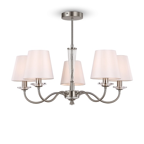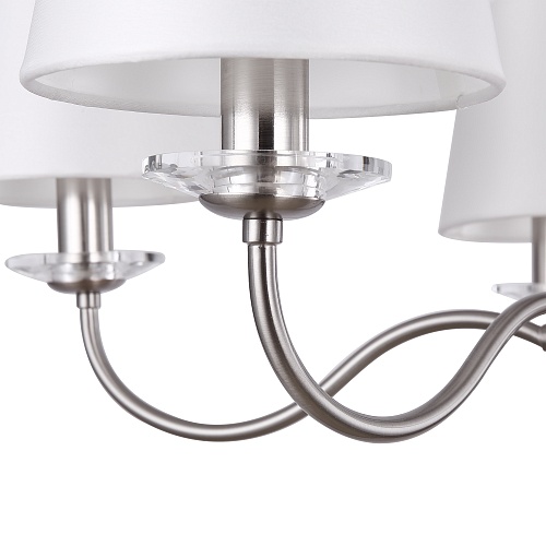 Металлическая арматура в двух оттенках на выбор: латунь и никель. Абажуры – текстиль белого цвета. Декоративные элементы из прозрачного стекла. Источник света – лампа с цоколем E14.