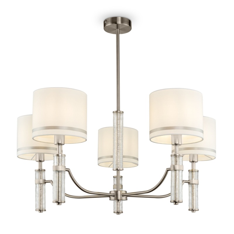 Эстетика неоклассицизма объединила светильники серии Albero – люстру на 7/5 ламп, бра и настольную лампу. Металлическая арматура цвета никеля подчеркнута оригинальным цилиндрическим декором из рельефного стекла – за счёт этого создается ощущение невесомости и легкости конструкции. Кремовые тканевые абажуры, обрамленные кантом, венчают композицию, придавая ей завершенный вид и даря мягкий, слегка приглушенный свет. Регулируемый подвес позволяет настроить оптимальную высоту люстры в зависимости от параметров помещения. Широкий выбор светильников в серии дарит возможность организовать комплексное, многоуровневое освещение в единой выдержанной стилистике.