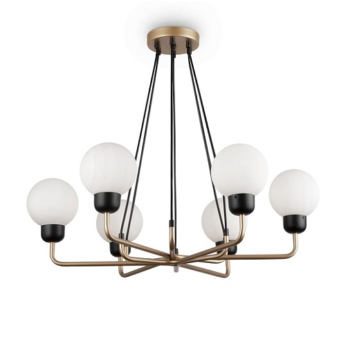 Легкость минимализма в сочетании с эстетикой постмодерна создает яркий и узнаваемый облик серии Venetti. Конструктивные особенности светильников, в частности, отсутствие центрального стержня, облегчают композицию, делая её компактной и невесомой. Арматура выполнена из металла золотого оттенка, а плафоны – из белого стекла. Их сферическая форма обеспечивает мягкое распределение светового потока, а модный рельефный рисунок добавляет дизайну индивидуальности. Серия включает подвесные люстры на 4 и 6 плафонов и предназначена для интерьеров в стиле лофт, mid-century modern, минимализм.