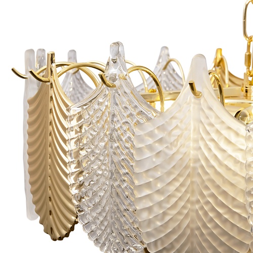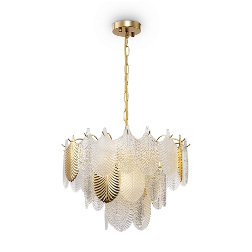 Металлическая арматура. Цвет – французское золото. Декор – рельефные лепестки двух видов: в тон арматуре и из прозрачного фактурного стекла. Современная интерпретация флористического дизайна. Источник света – лампа с цоколем Е14.