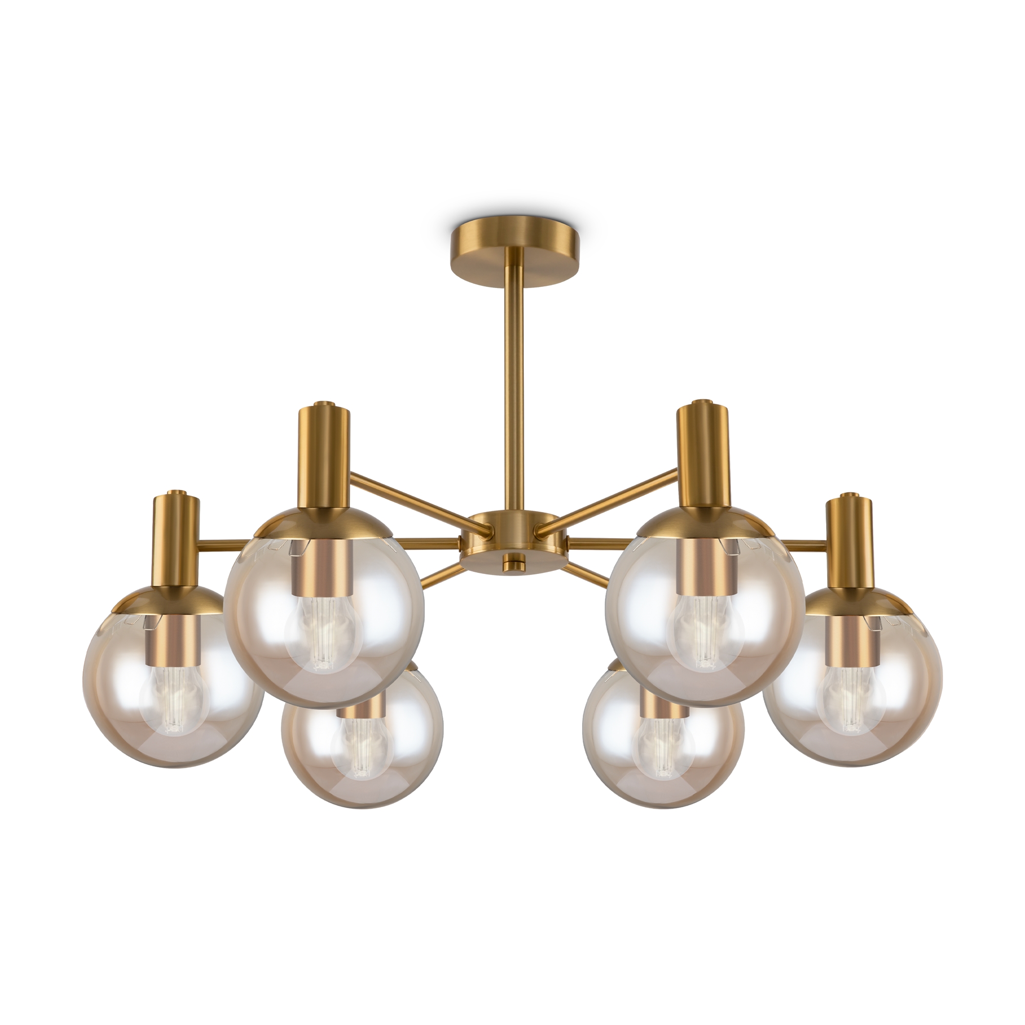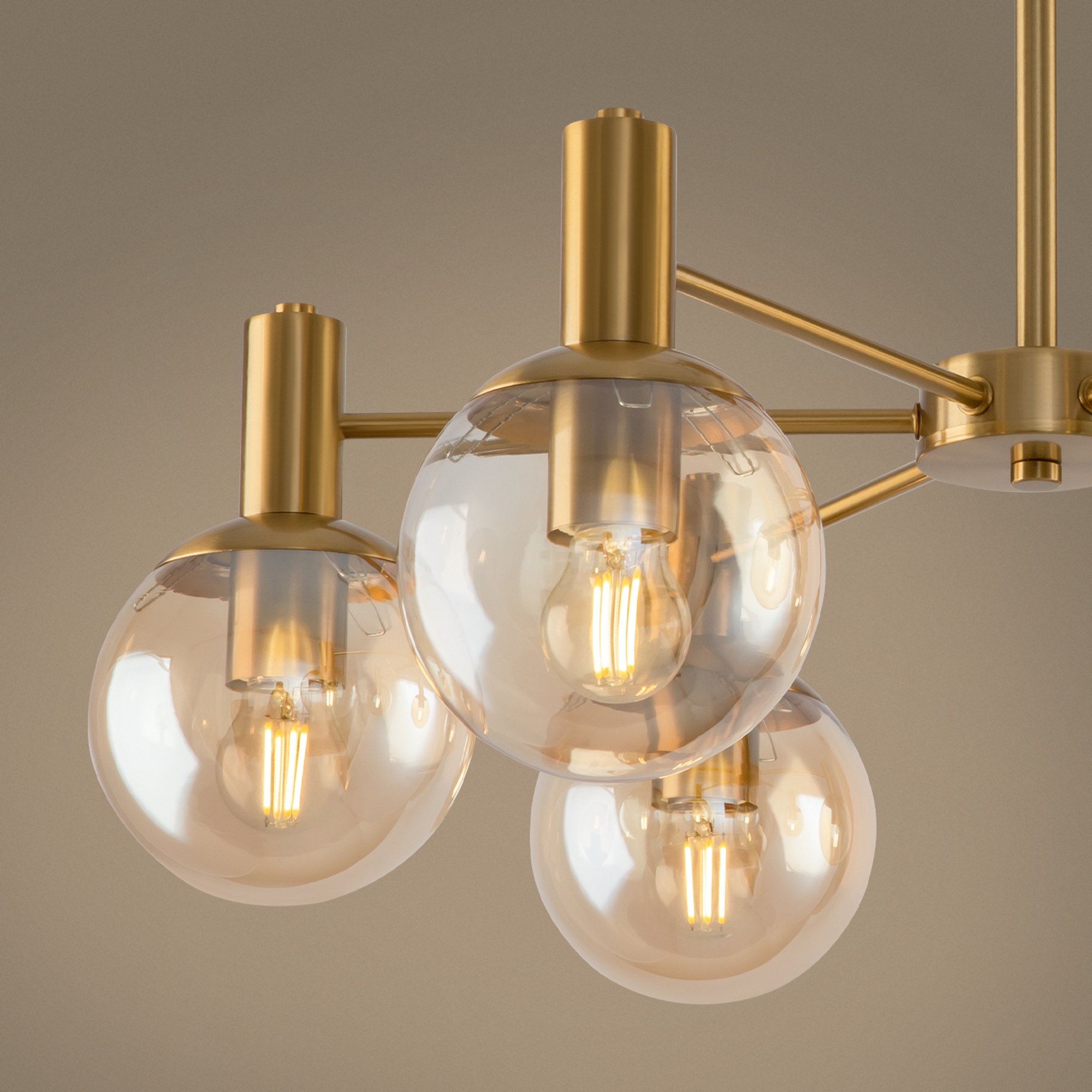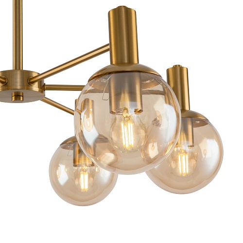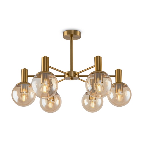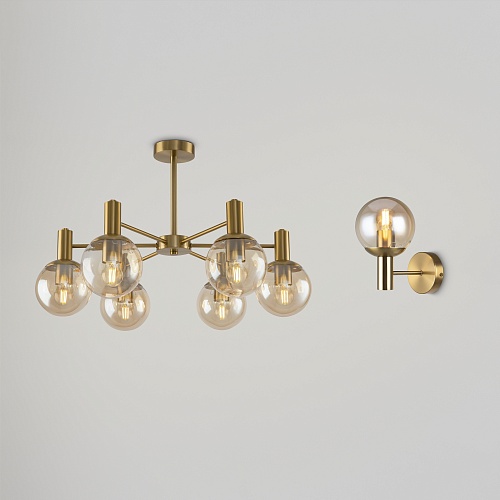 Брутальная романтика лофта и сдержанность минимализма объединились в дизайне серии Globo. Металлическая арматура окрашена в цвет латуни. Её строгая геометрия разбавлена округлыми плафонами-сферами. Выполненные из полупрозрачного стекла и гальванизированные в цвет шампань, они беспрепятственно пропускают свет, обеспечивая яркую направленную подсветку. Потолочные светильники серии – люстры, рассчитанные на 6 и 8 плафонов – отлично подойдут для стандартных потолков. Также в серии представлено бра для зональной подсветки. Светильники будут выигрышно смотреться в интерьерах, оформленных в стиле лофт, минимализм, сканди.