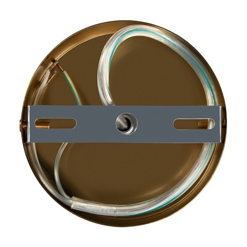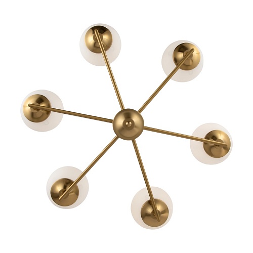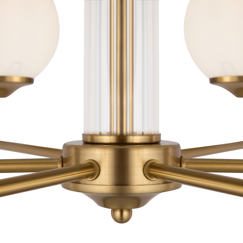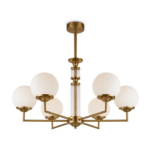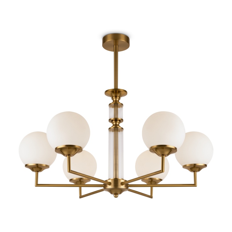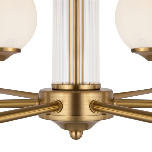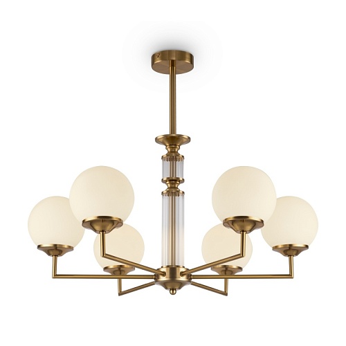 Металлическая арматура окрашена в цвет латуни. Плафоны-сферы из матового белого стекла. Декор – прозрачное рельефное стекло. Источник света – лампа с цоколем Е27.