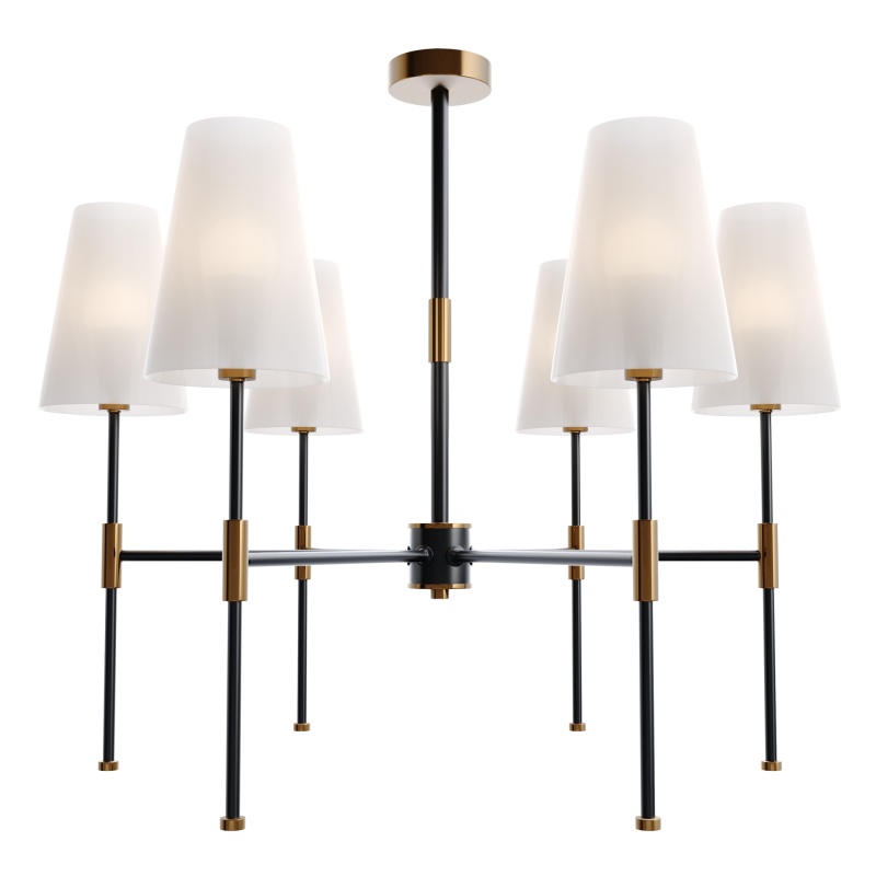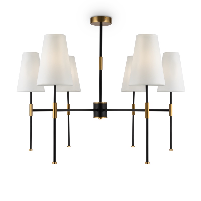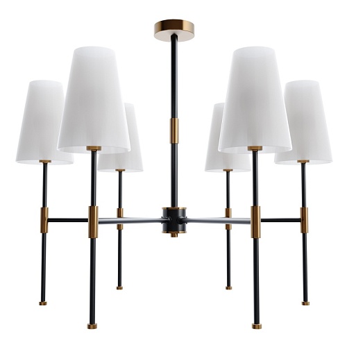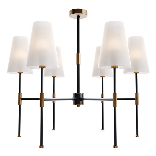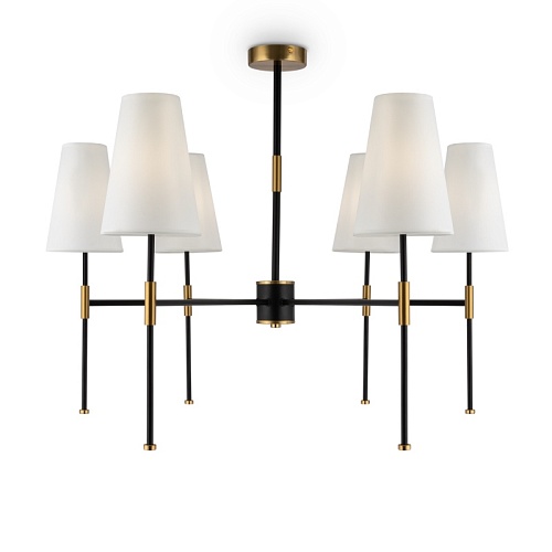 Материал арматуры – металл. Оттенки: хром, комбинация черного и латуни. Абажуры – белая ткань. Акцентный вытянутый силуэт. Источник света – лампа с цоколем E14.