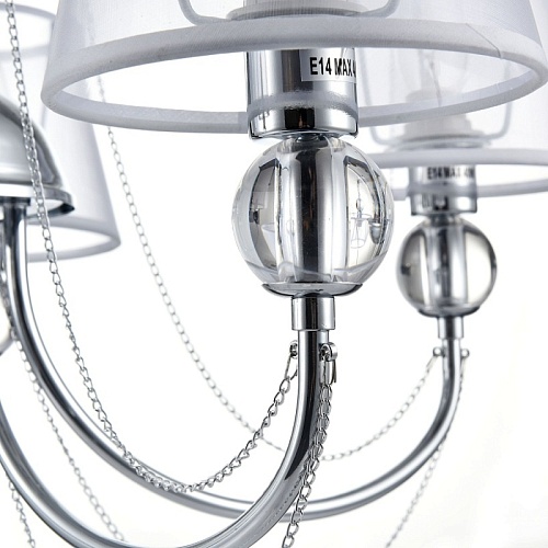 Светильники станут украшением интерьера, придадут ему шарм. Арматура светильников - из металла, а абажуры – из прозрачной органзы и ПВХ. Каждый из светильников серии дополнен тонкими серебристыми цепочками, а основания рожков украшены стеклянными прозрачными шарами. Завершающий элемент дизайна светильников Beverly – это декоративные подвески.