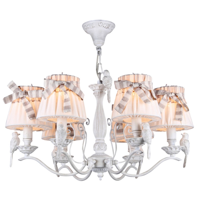 Материал арматуры – металл, цвет – белый антик. Льняные абажуры дополнены лентами. Резные элементы. Символичный декор - фигурки птиц на розетках. Высота люстр регулируется.