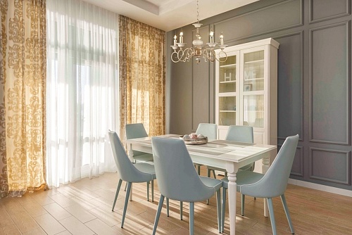 Металлическая арматура, цвет – золото с кремовыми вставками. Декоративные рожки с флористическими элементами. Источники света в форме свечей. Высота люстр регулируется длиной цепи.