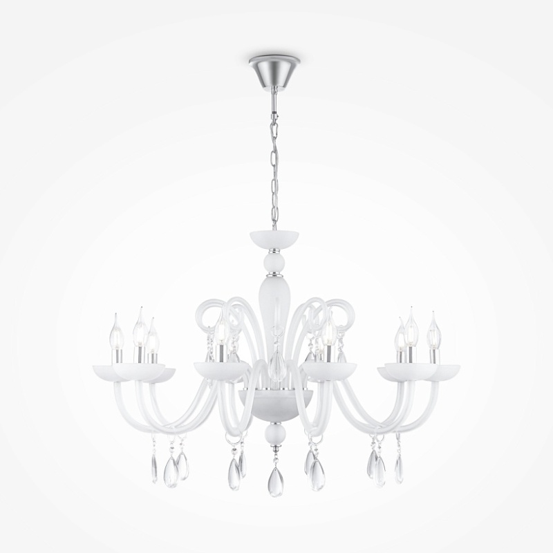 Оригинальный внешний вид светильников серии обусловлен матовыми стеклянными деталями, которые составляют большую часть конструкции. Светильники украшены подвесками в форме капель. Они закреплены на рожках с помощью стеклянных колец. Высоту люстр возможно изменить, регулируя высоту цепи.