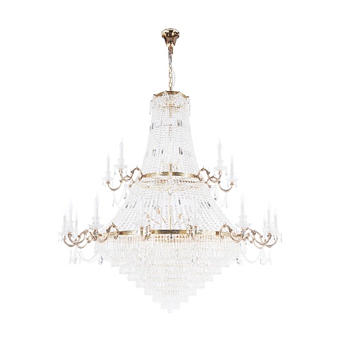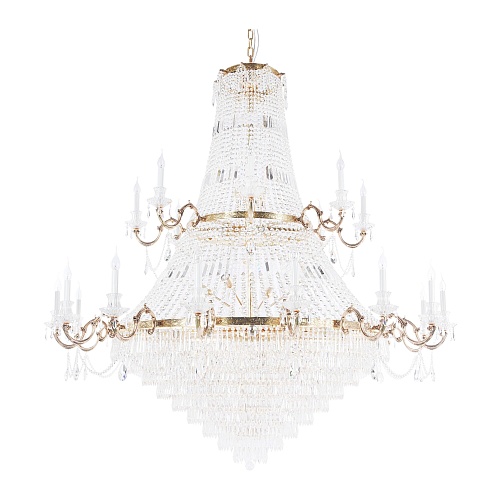 Арматура из металла, цвет – античное золото. Декор металлических элементов – инкрустированный цветочный орнамент. Многоярусные хрустальные подвески скрывают лампы. Часть моделей имеет открытые источники света в виде свечей.