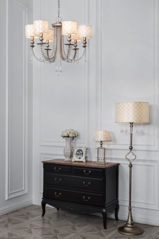 Светильники серии передают особое настроение. Богато украшенные, они наполнят освещаемый интерьер атмосферой блеска и роскоши. Арматура сделана из металла и окрашена в серебристый цвет с эффектом искусственного старения. Абажуры из ткани с орнаментом на ПВХ выполнены в стиле ар-деко. Финальный образ светильников формируют подвески из кристаллов.