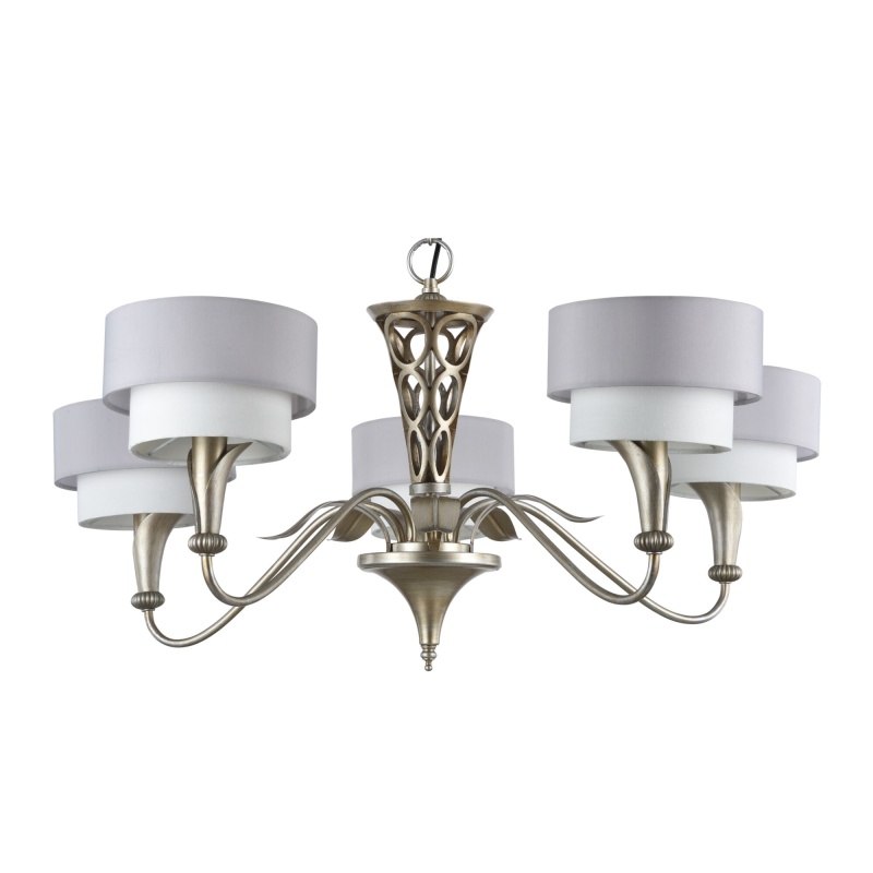 Металлическая арматура окрашена в цвет античного серебра. Двойные абажуры из хлопка на ПВХ, комбинация белого и серого цвета. Флористический декор. Высота люстр регулируетс