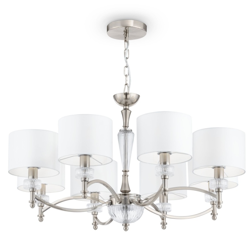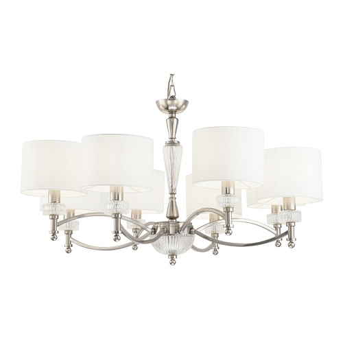 Материал основания – металл, цвет – никель. Абажуры из белой ткани на ПВХ. Декор центральной части и рожков – прозрачное литое стекло с рельефной фактурой. Высота люстр регулируется длиной цепи.