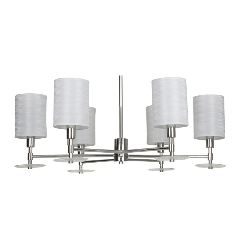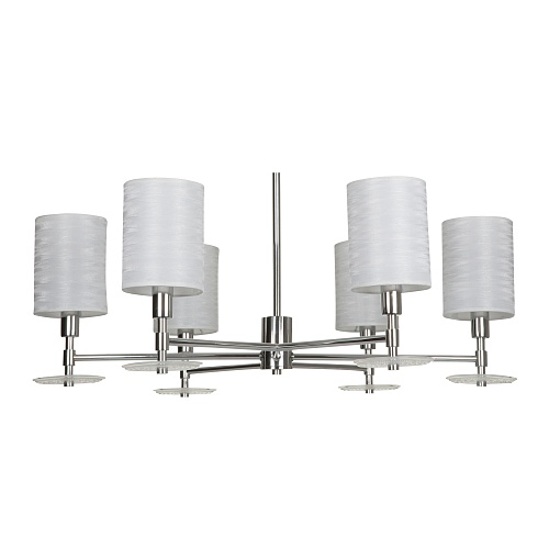 Простой каркас из никелированного металла образован сочетанием горизонтальных и вертикальных линий. Он украшает декоративные блюдца из прессованного стекла. Отдельного внимания в конструкции светильников заслуживают абажуры, сделанные из ткани на ПВХ. Они добавляют светильникам элегантности и тепла.