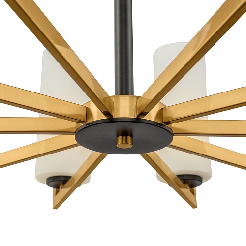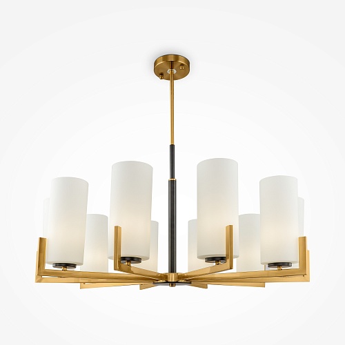 Арматура из металла, оттенок — латунь. Стеклянные плафоны в белом цвете. Часть элементов окрашена в контрастный черный оттенок. Геометрия в дизайне: цилиндрические плафоны, прямоугольные рожки.