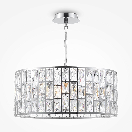 Металлическая арматура, цвет – хром. Каркас абажура – металл, декор – прозрач ный хрусталь. Потолочные модели с рассеивателем из матового стекла. Высота подвесных светильников регулируется.