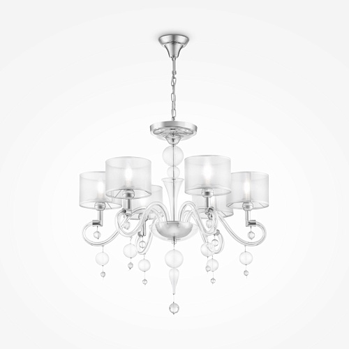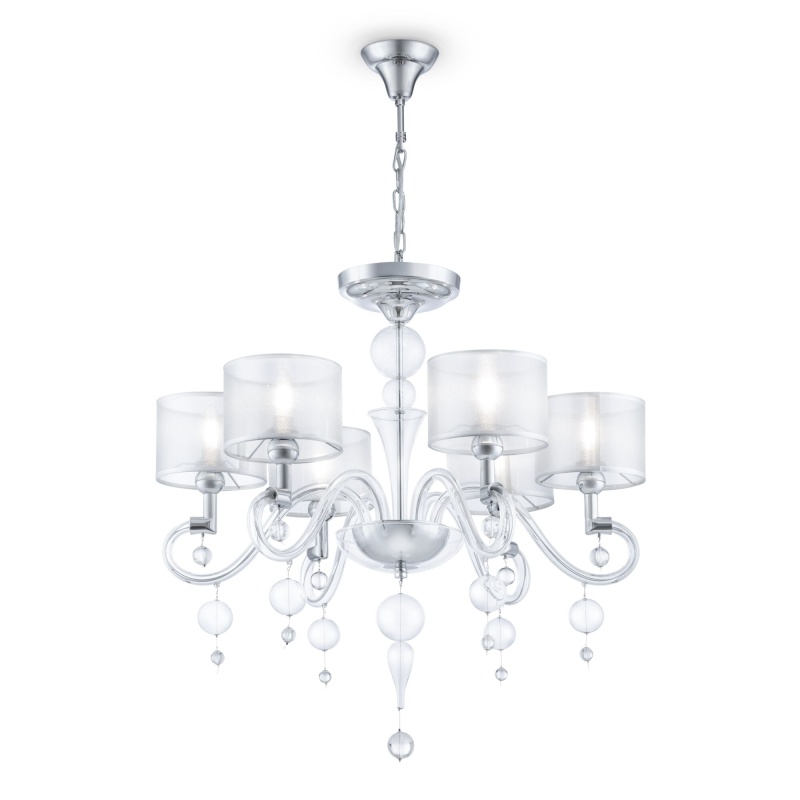Хромированная металлическая арматура. Абажуры из белой органзы на ПВХ. Декор – прозрачное выдувное стекло. Крепление 2 в 1 – монтаж с цепью и без нее.