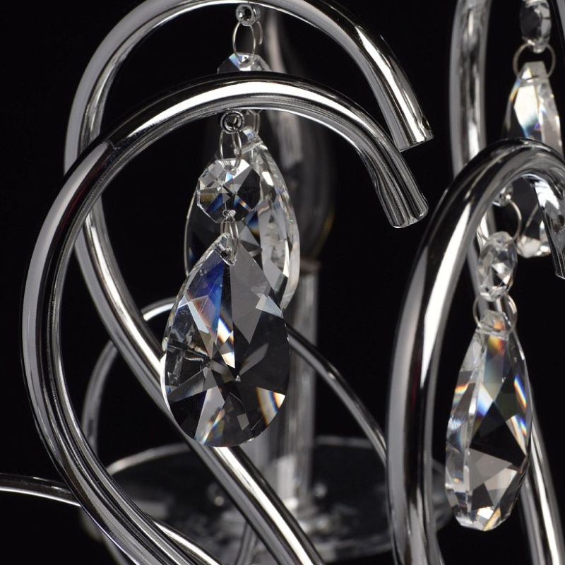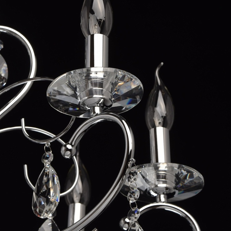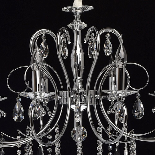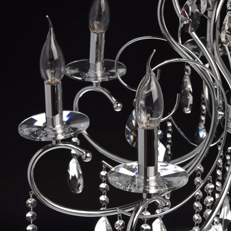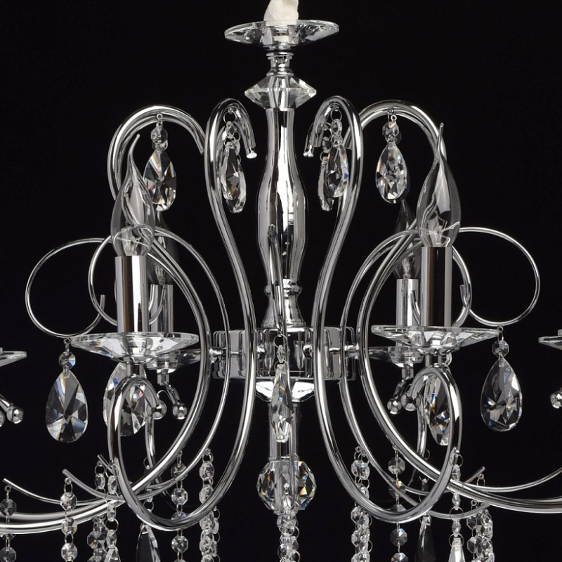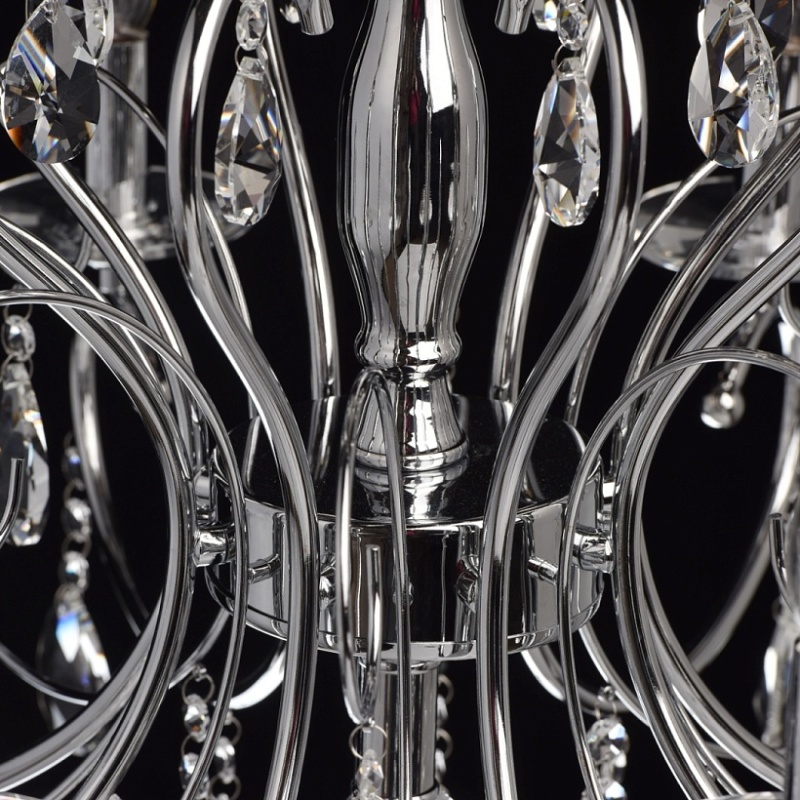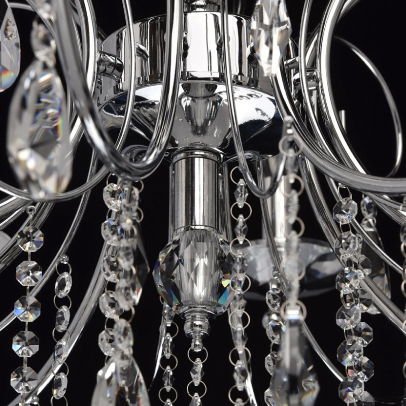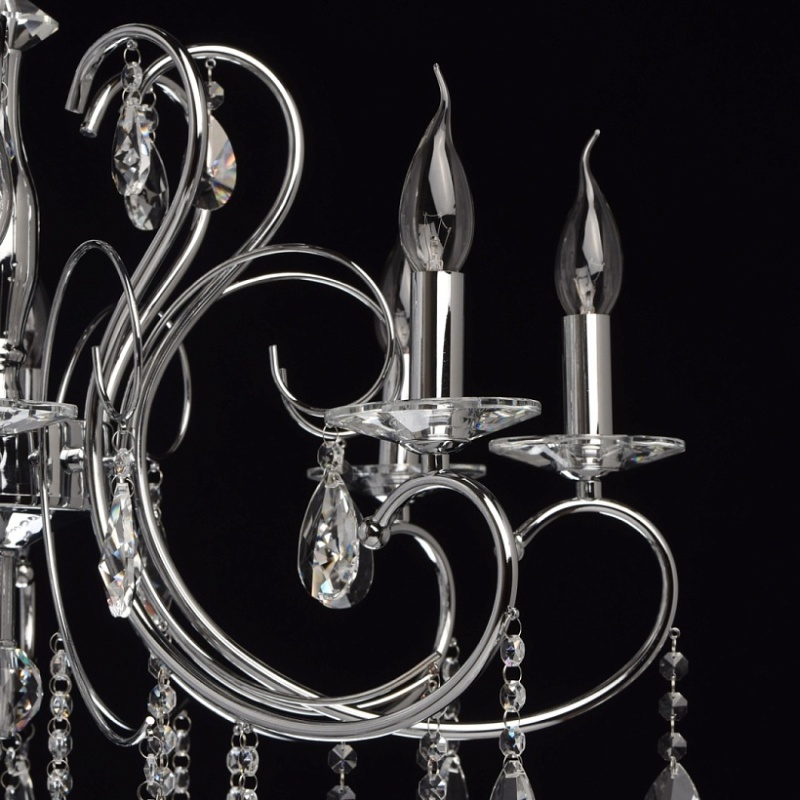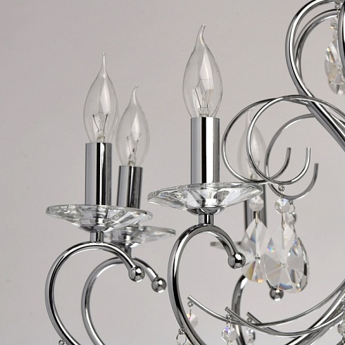Основание: металл, гальванизировано в цвет хрома. Рожки и декоративные элементы выполнены по технологии проката на роликовом станке. Центральная ось декорирована массивами хрусталя со сложной огранкой. Декоративные розетки выполнены из массива хрусталя. Светильник декорирован подвесками из хрусталя высокого качества формы октагон и миндаль.