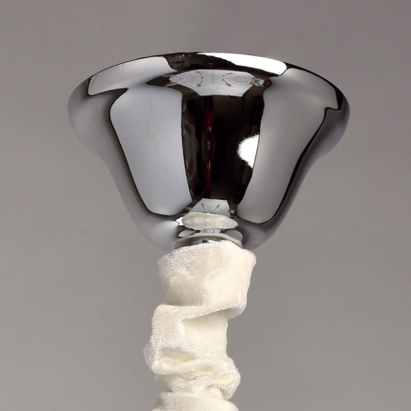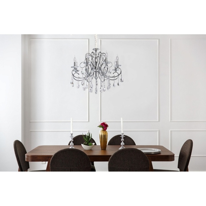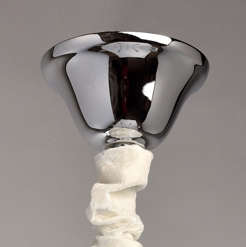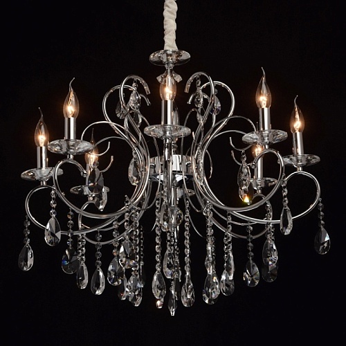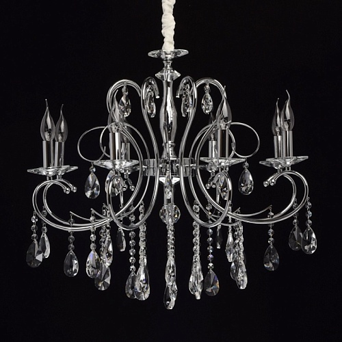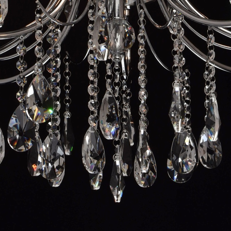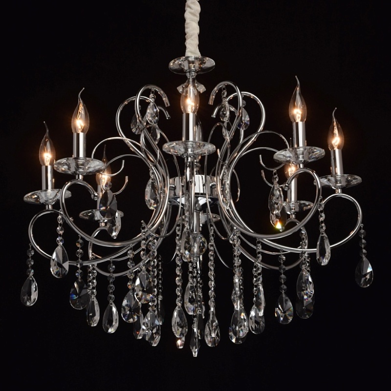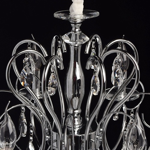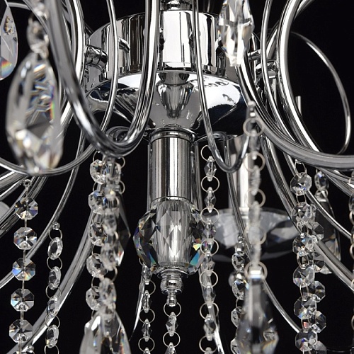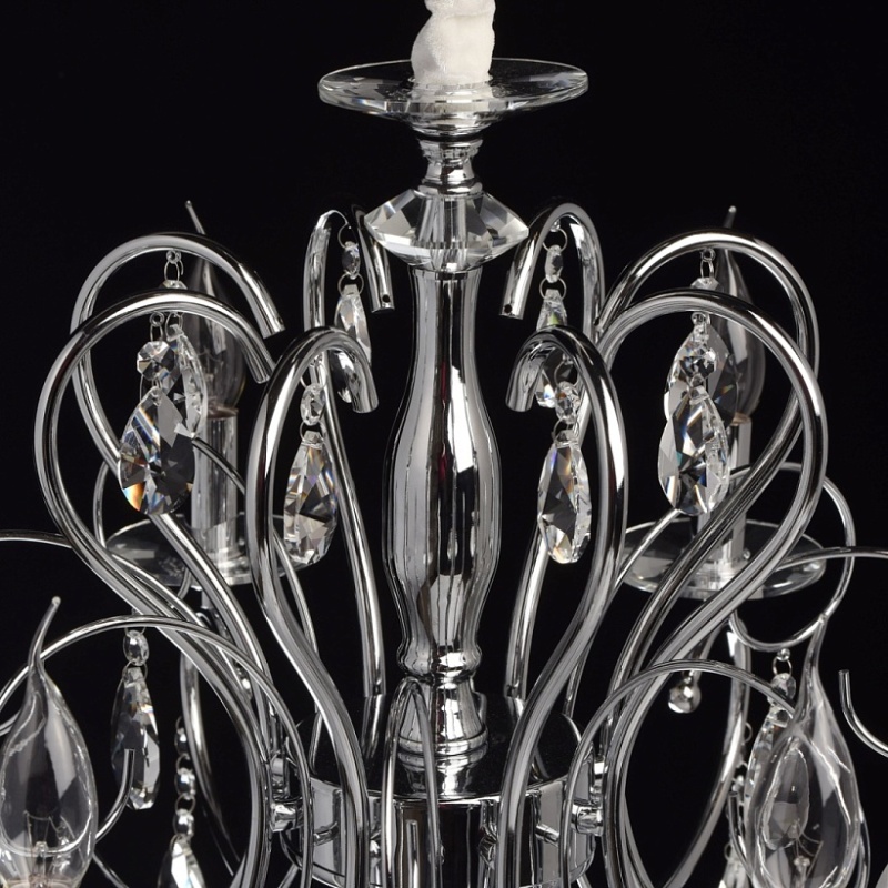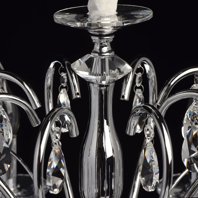 Основание: металл, гальванизировано в цвет хрома. Рожки и декоративные элементы выполнены по технологии проката на роликовом станке. Центральная ось декорирована массивами хрусталя со сложной огранкой. Декоративные розетки выполнены из массива хрусталя. Светильник декорирован подвесками из хрусталя высокого качества формы октагон и миндаль.