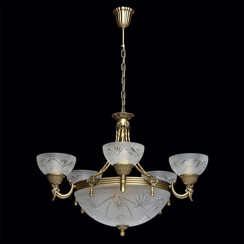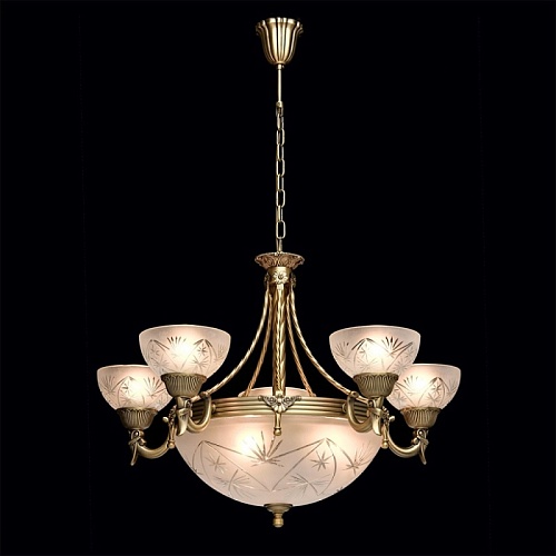 Арматура светильника выполнена из комбинации сплава железа и сплава алюминия и гальванизирована в цвет античной бронзы с эффектом патинирования. Основание, центральная ось и каркас плафона выполнены из сплава железа. Декоративные элементы изготовлены по технологии твист. Рожки изготовлены из сплава алюминия по технологии художественного литья. Плафоны изготовлены из прозрачного стекла , обработанного пескоструйным матированием с рисунком нанесенным по технологии алмазной резьбы. Центральный плафон декорирован художественным литьем из сплава алюминия.