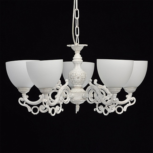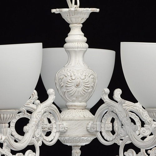 Основание: комбинация сплавов металлов, обработано по технологии двойного окрашивания, основной цвет золотого цвета, декоративный - белого.Потолочная чаша: металл, обработка на токарном станке.Корпус, декоративные розетки: металл, прессование.Рожки, декоративная гайка: сплав алюминия, художественное литье. Плафон: отлит в форму, матирование.
