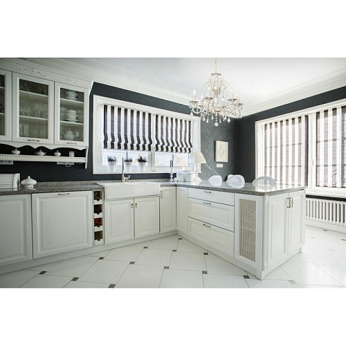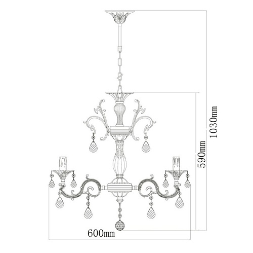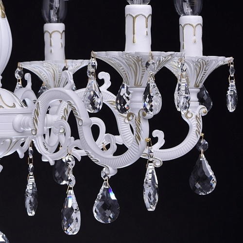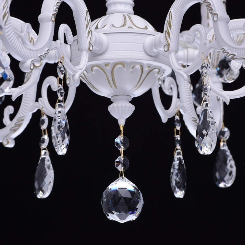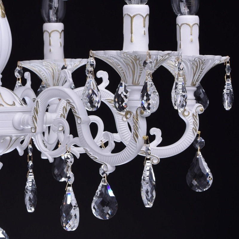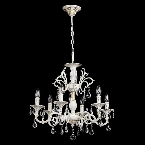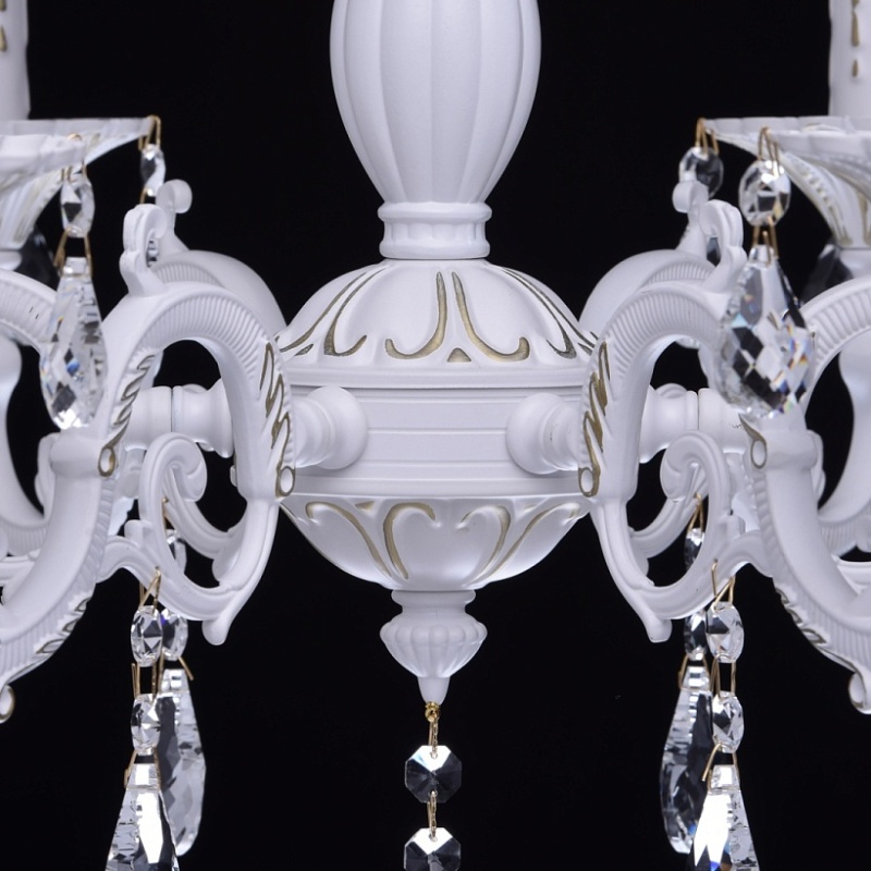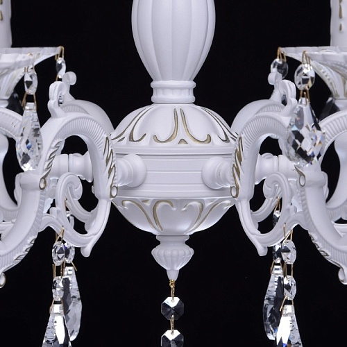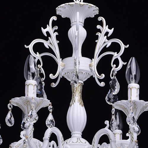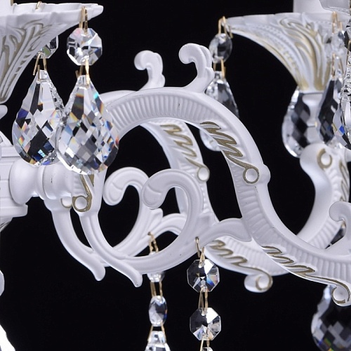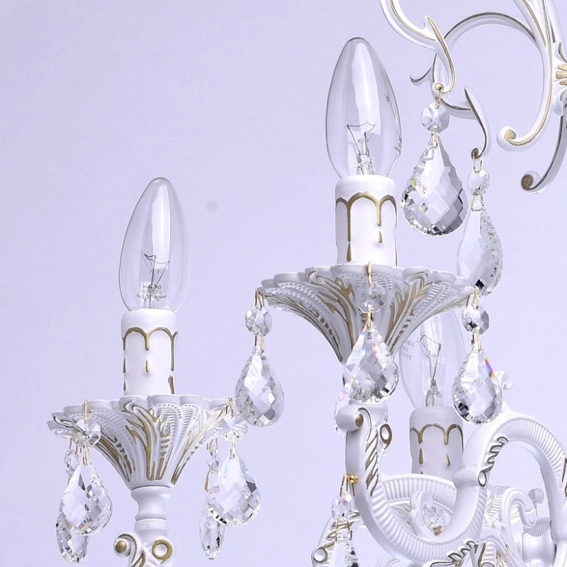 Основание светильника выполнено из комбинации сплавов металлов и обработано по технологии ручного окрашивания: основной защитный слой белого матового цвета, затем в ручную окрашены выступающие части орнамента. Основание светильника выполнено из сплава металла по технологии прессования. Рожки, центральная ось, декоративные элементы и декоративные розетки выполнены из сплава алюминия с цинком по технологии художественного литья в кокиль под давлением. Светильник декорирован подвесками из хрусталя категории "a-grade" сложной огранки