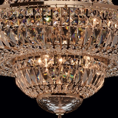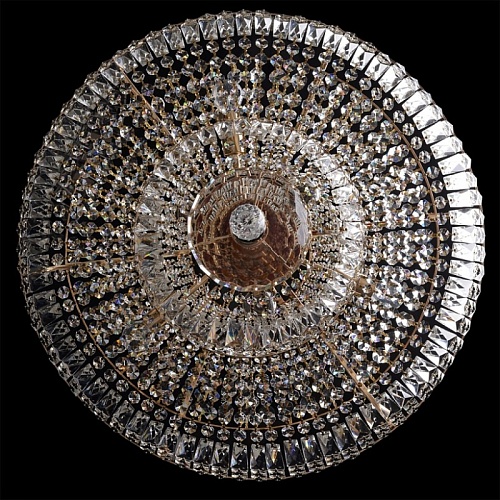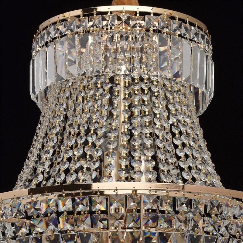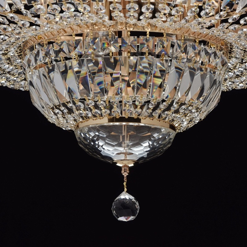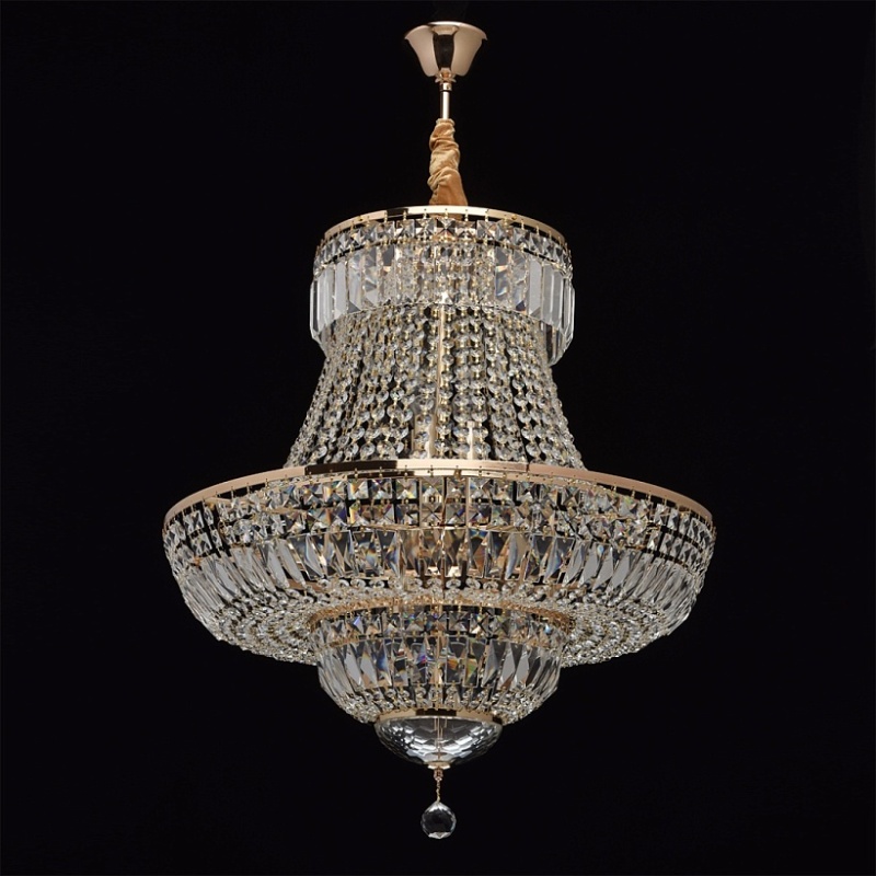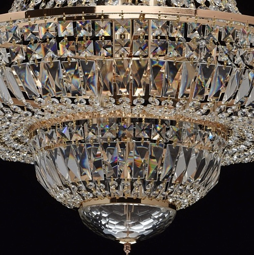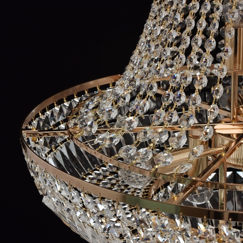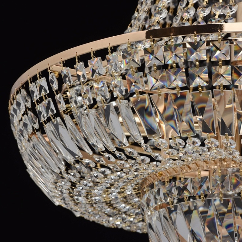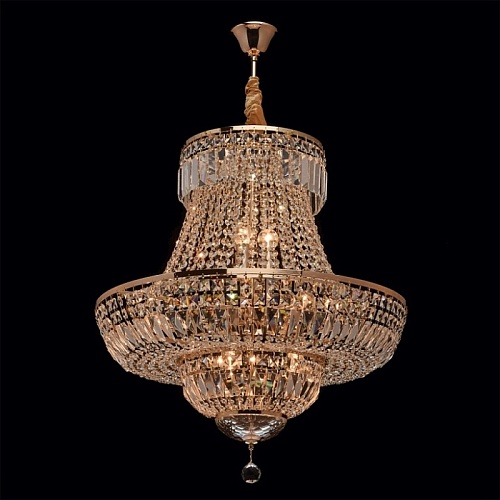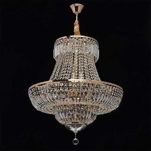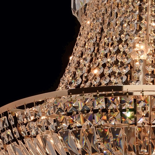 Металлическая арматура гальванизирована в цвет золота, каркас светильника выстроен в четыре яруса. Хрустальный декор ручной работы сочетает в себе кристаллы трех видов. Нижний ярус представлен хрустальным массивом в виде чаши, со сложной огранкой. Хрусталь с высоким содержанием свинца F&D A Grade и исключительными показателями дисперсии.