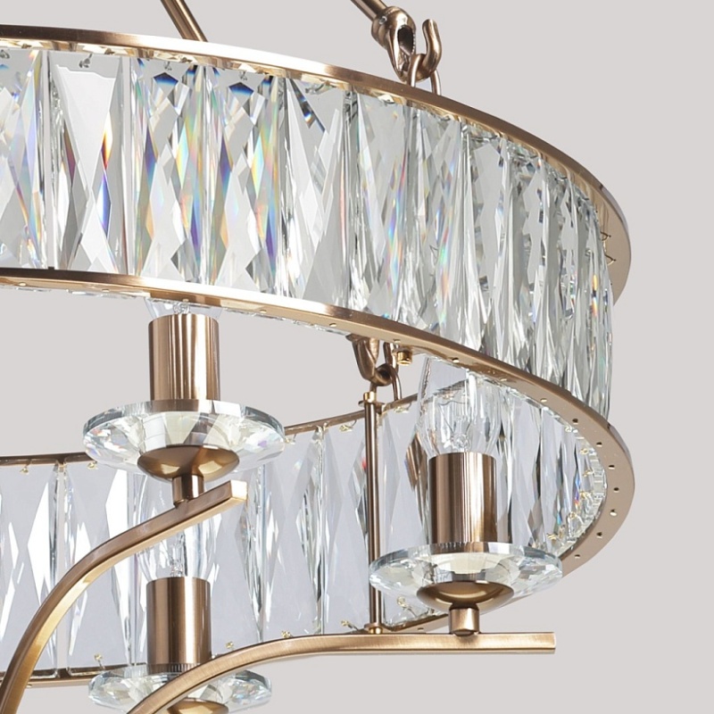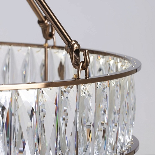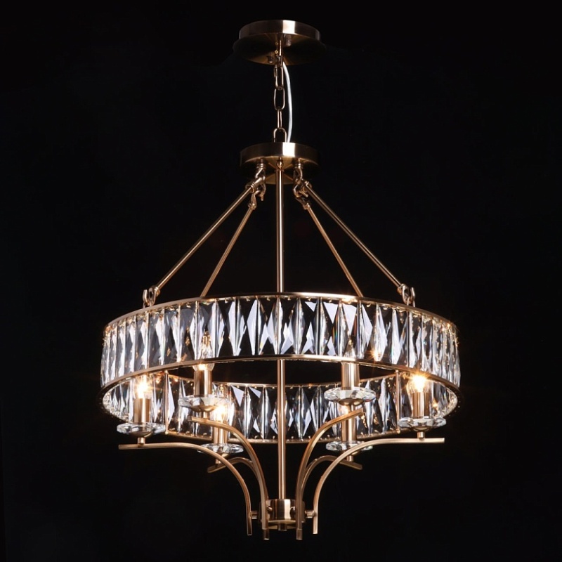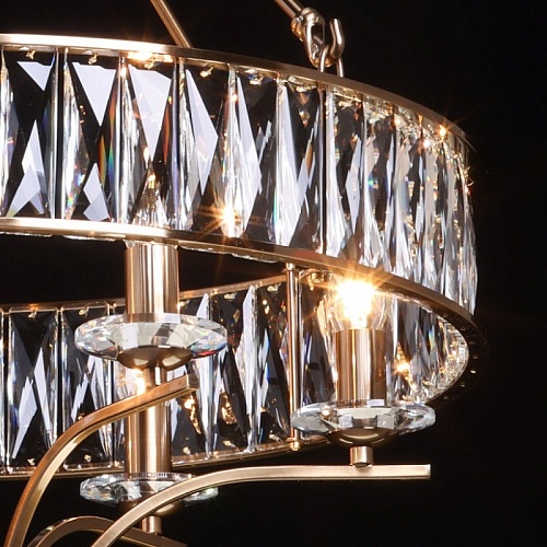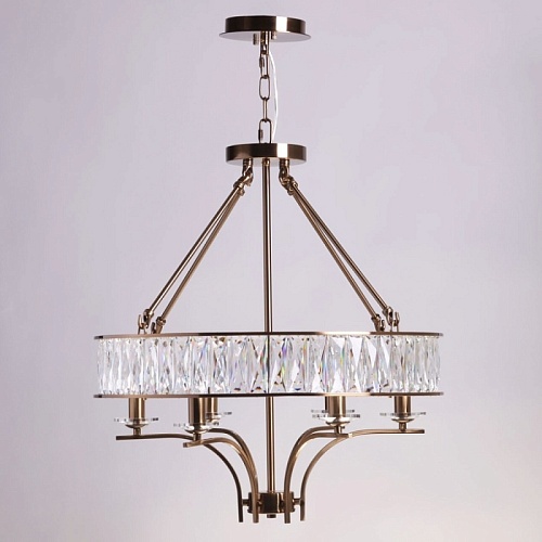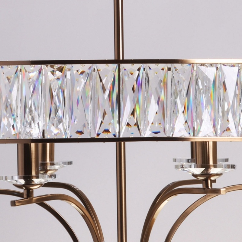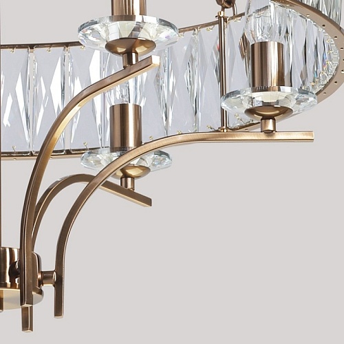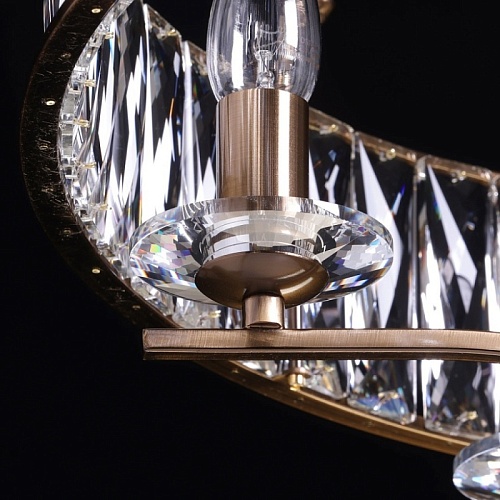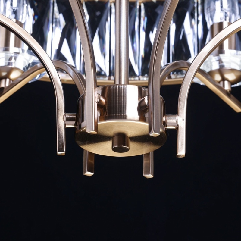 Металлическое основание светильника гальванизировано в цвет бронзы. Люстра декорирована прозрачным хрусталем прямоугольной формы и декоративными розетками из массива хрусталя.