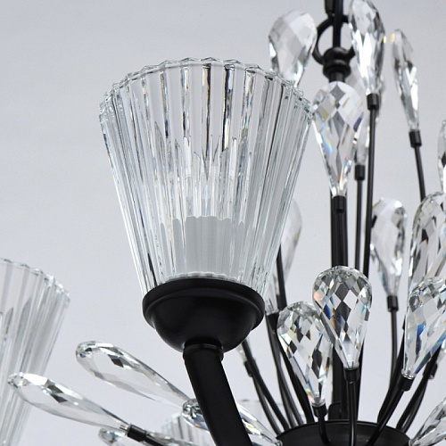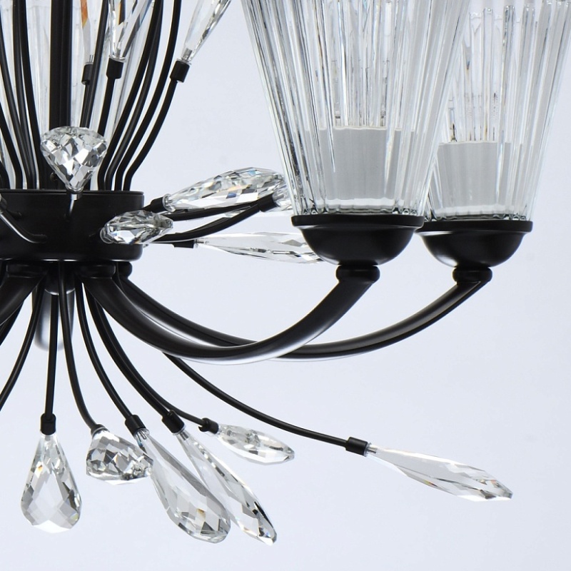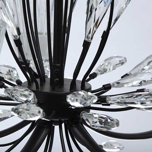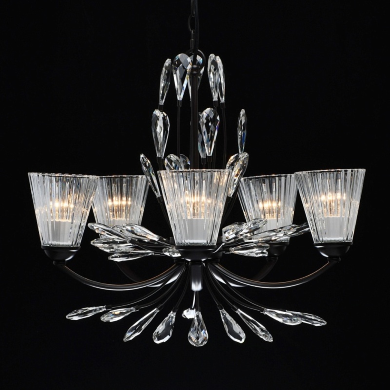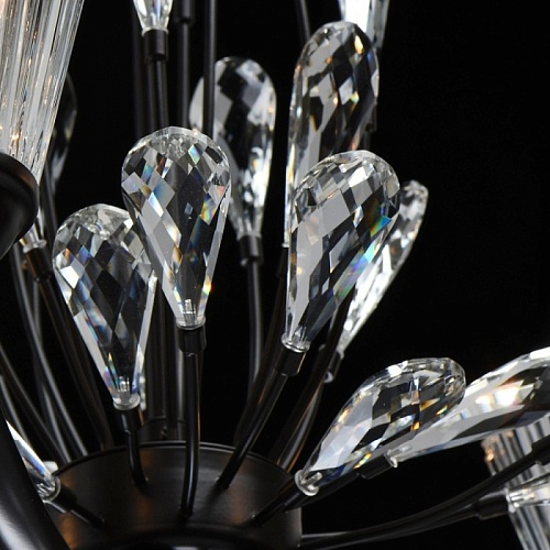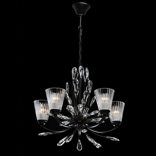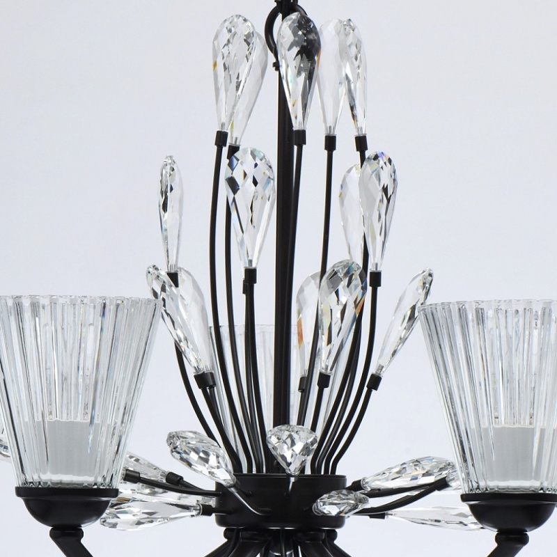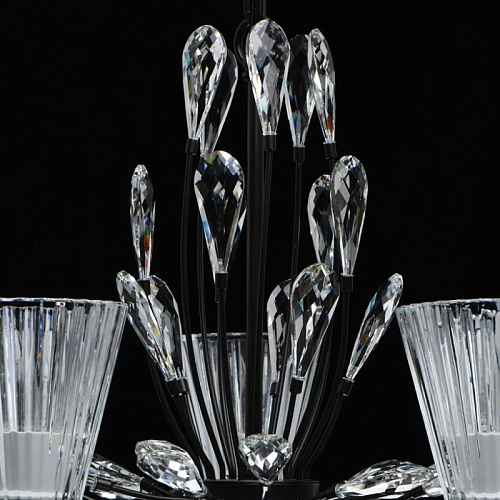 Основание светильника выполнено из металла и окрашено в коричневый цвет. Фактурные толстостенные стеклянные плафоны отлиты в сложную форму. Светильник декорирован прозрачным хрусталем оригинальной формы.