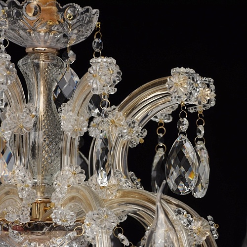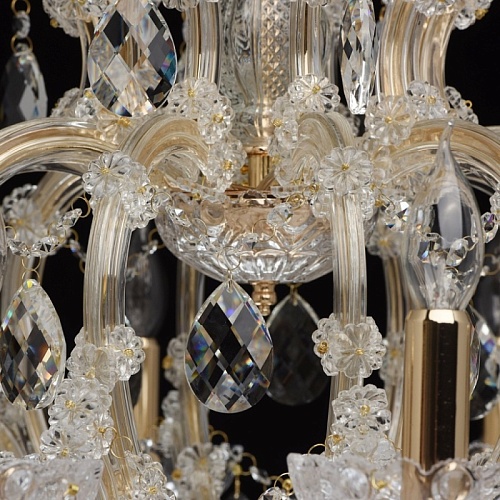 Металлическое основание светильника гальванизировано в цвет золота и закрыто прозрачными стеклянными пластинами. Декоративные розетки выполнены из стекла, отлитого в сложную форму. Светильник декорирован прозрачным хрусталем миндалевидной формы со сложной огранкой.