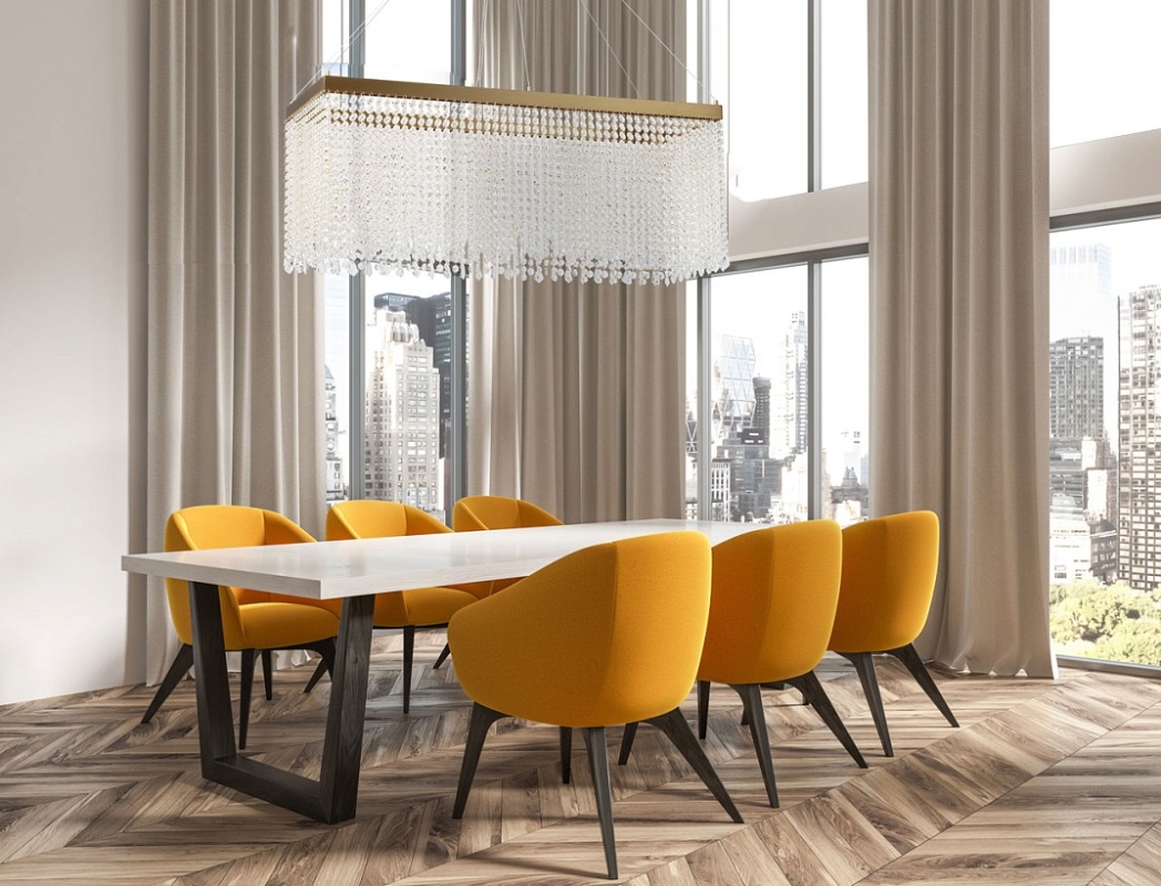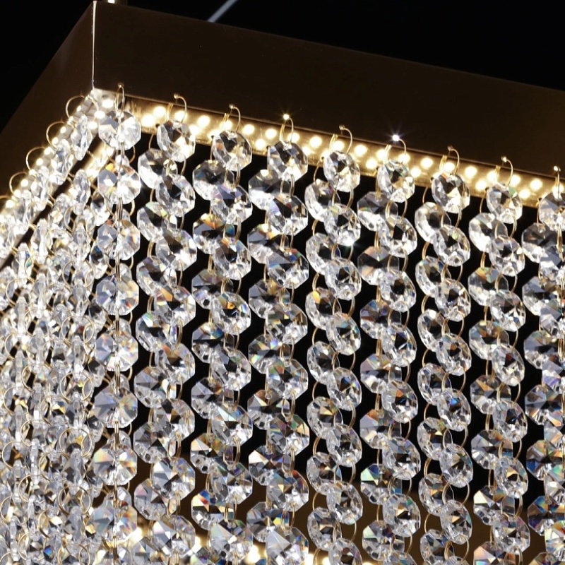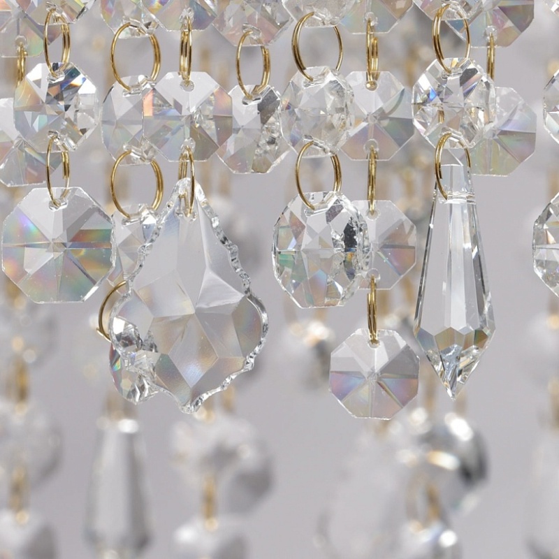 Основание люстры из нержавеющей стали гальванизировано в цвет золота. Люстра декорирована каскадом подвесок из прозрачного хрусталя.