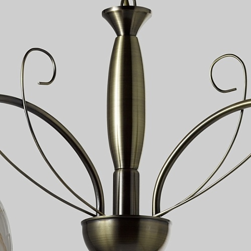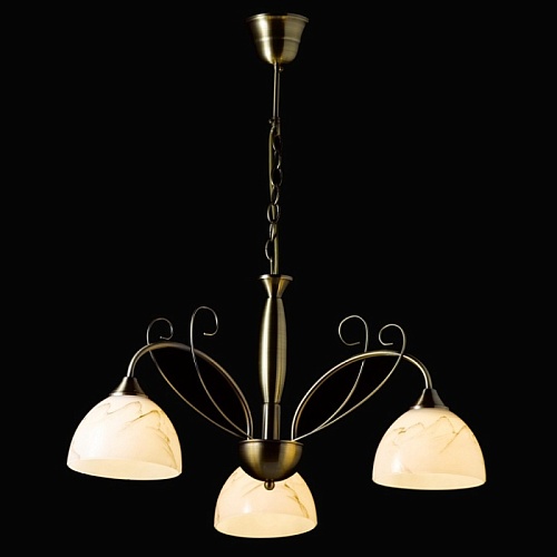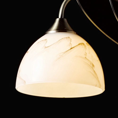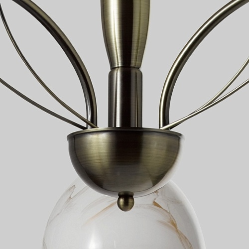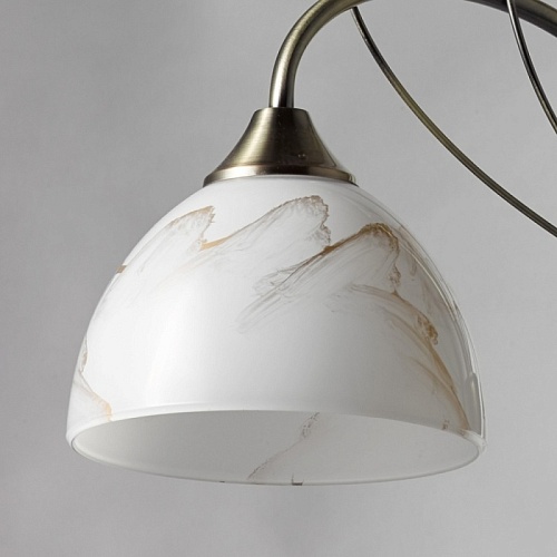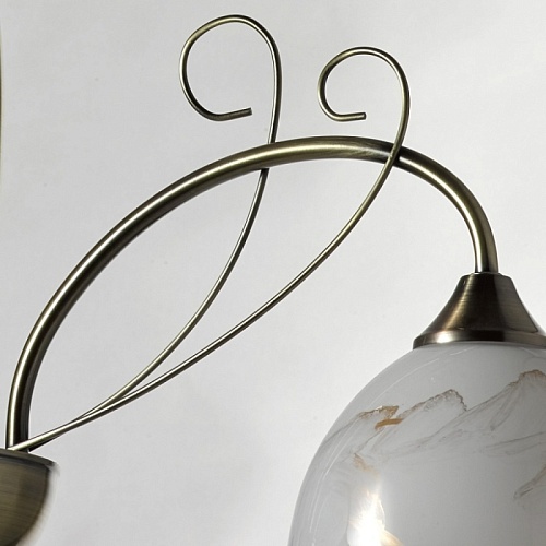 Основание светильника выполнено из металла и гальванизировано в цвет античной бронзы с последующим тональным лакированием. Стеклянные плафоны окрашены изнутри в золотой цвет, имитирующей рисунок мрамора и покрыты белой краской.