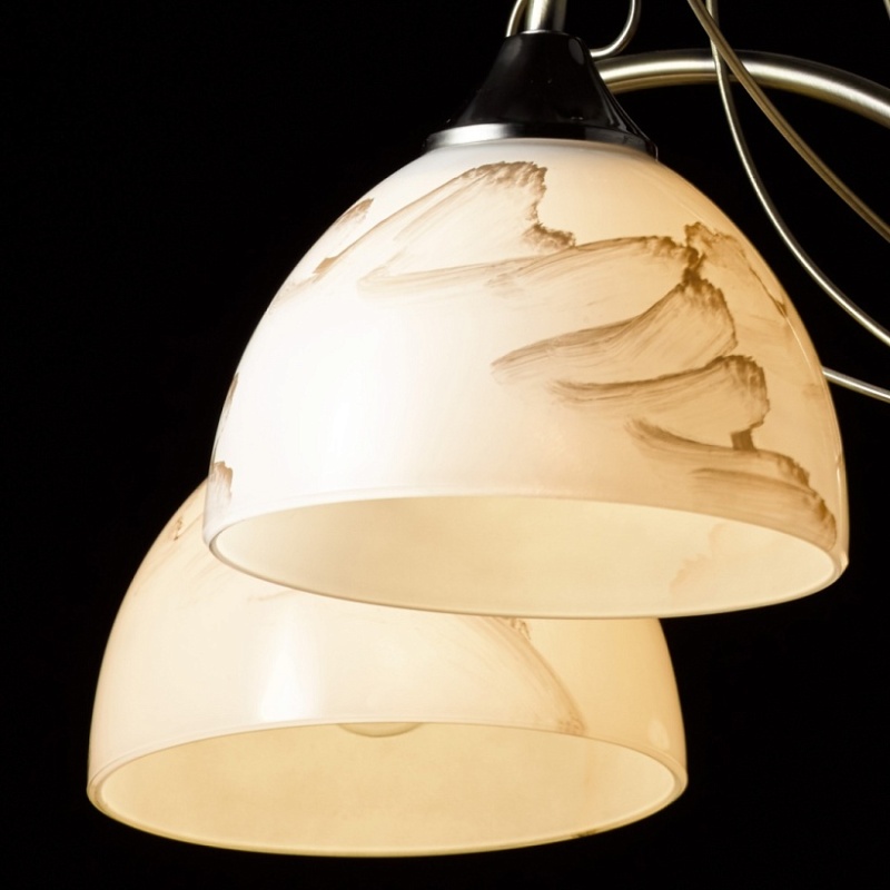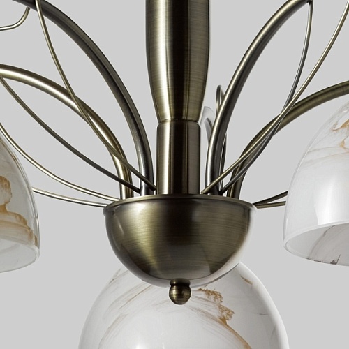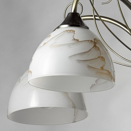 Основание светильника выполнено из металла и гальванизировано в цвет античной бронзы с последующим тональным лакированием. Стеклянные плафоны окрашены изнутри в золотой цвет, имитирующей рисунок мрамора и покрыты белой краской.