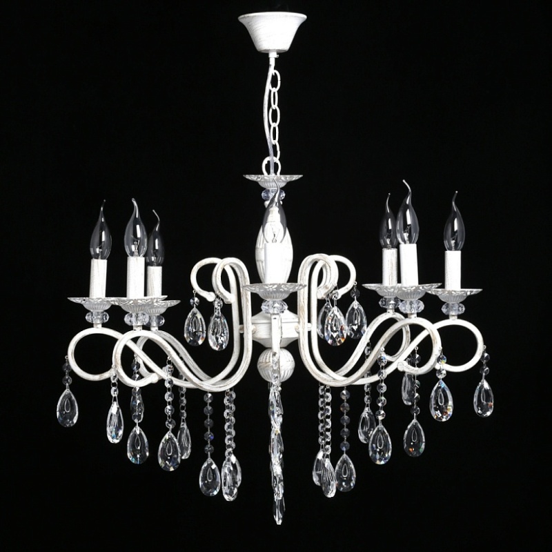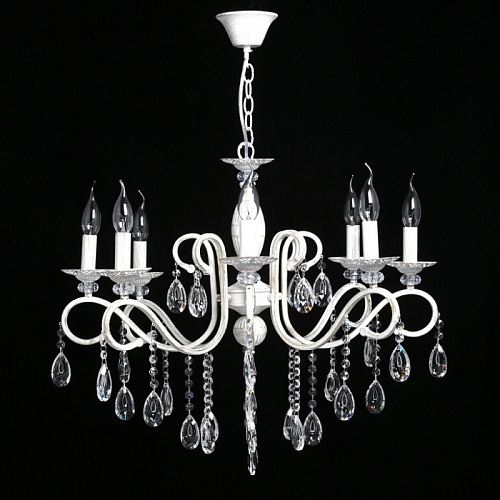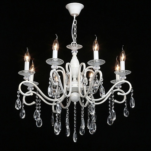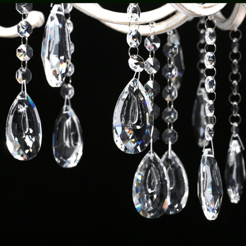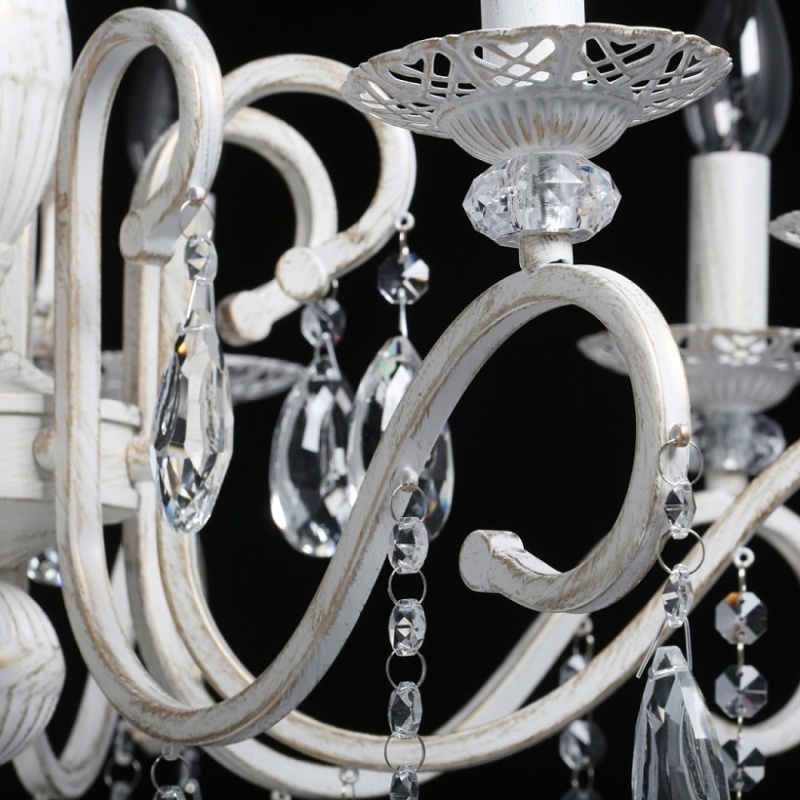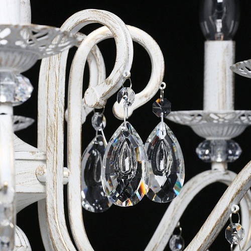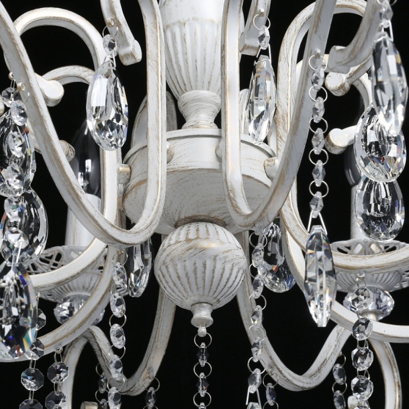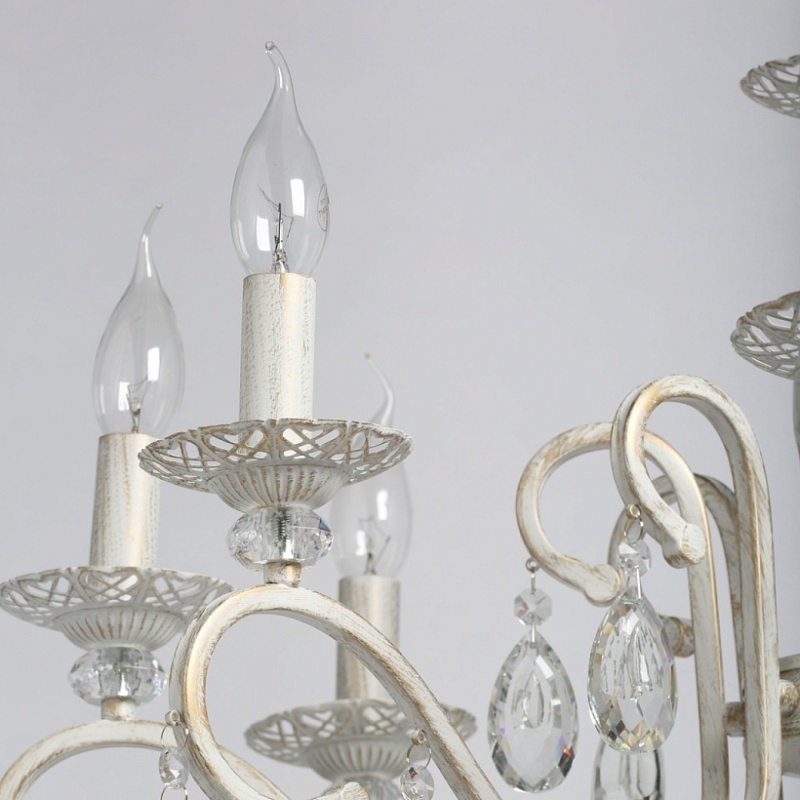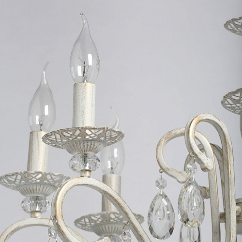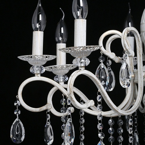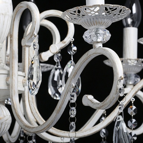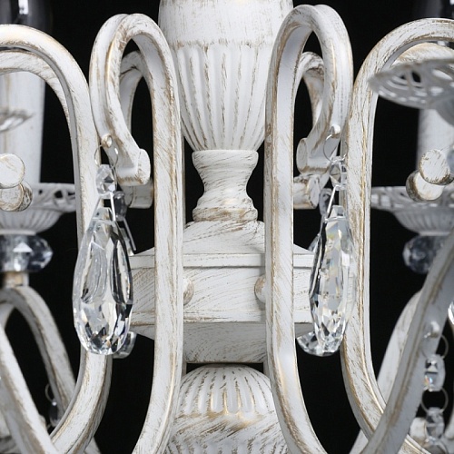 Основание светильника выполнено из металла и обработано по технологии хай-лайт, где основной слой белого цвета, а декоративный слой золотого цвета. Светильник декорирован прозрачным хрусталем. Под декоративными розетками декор из прозрачного акрила.