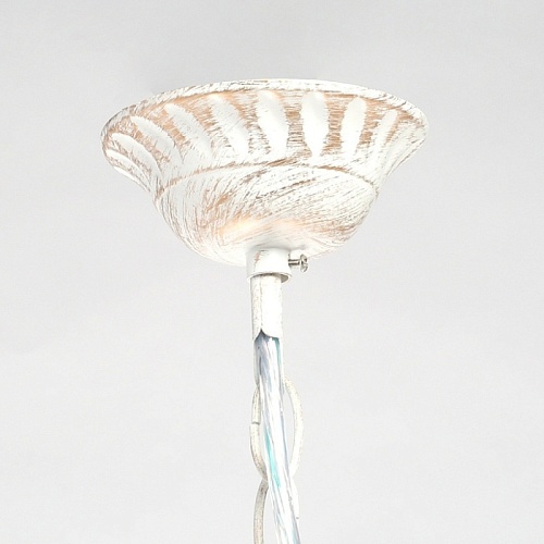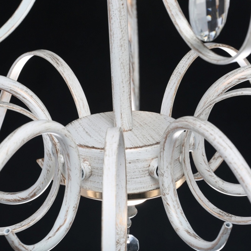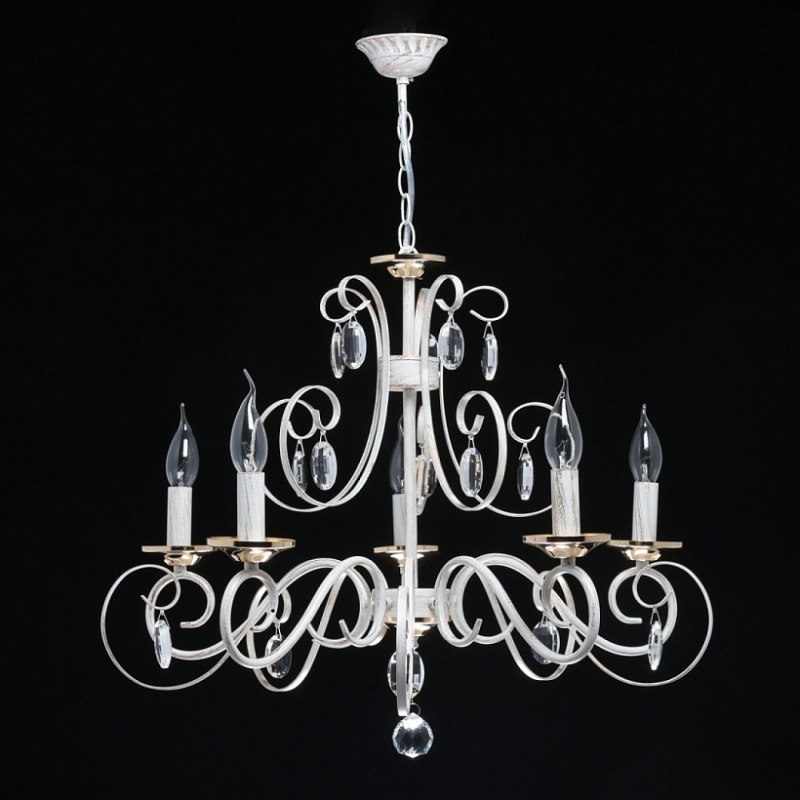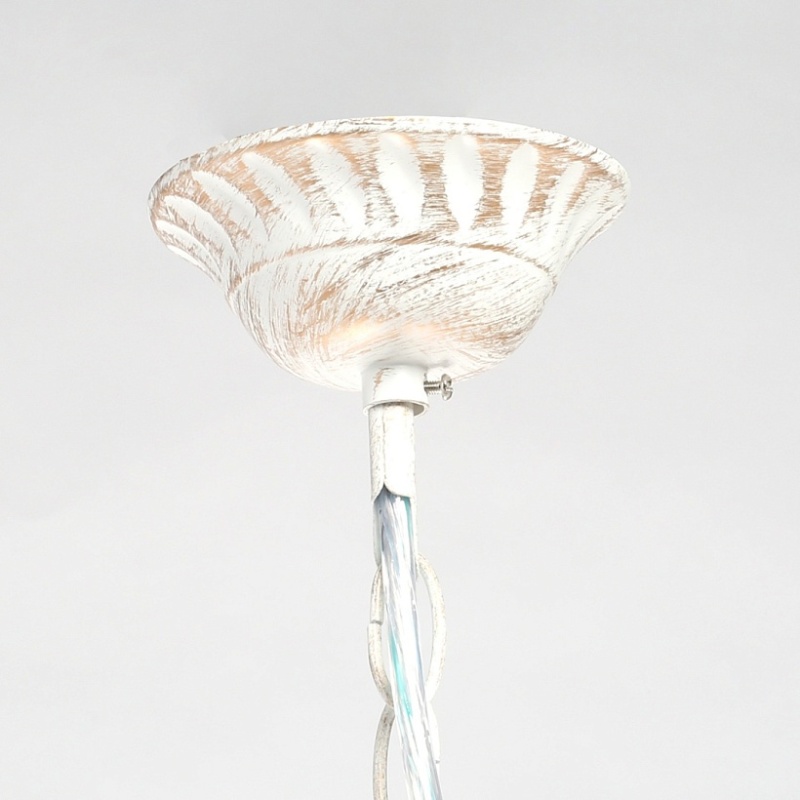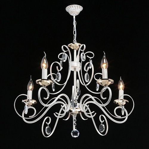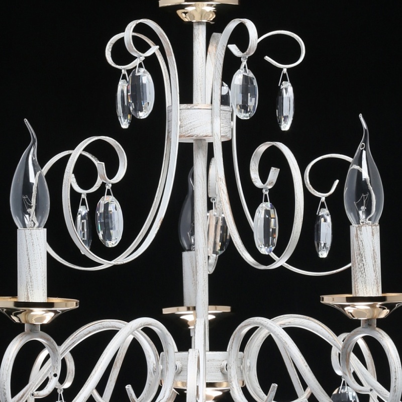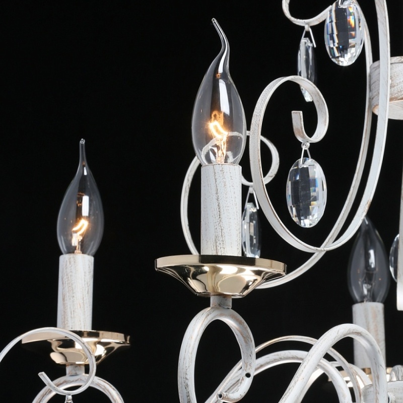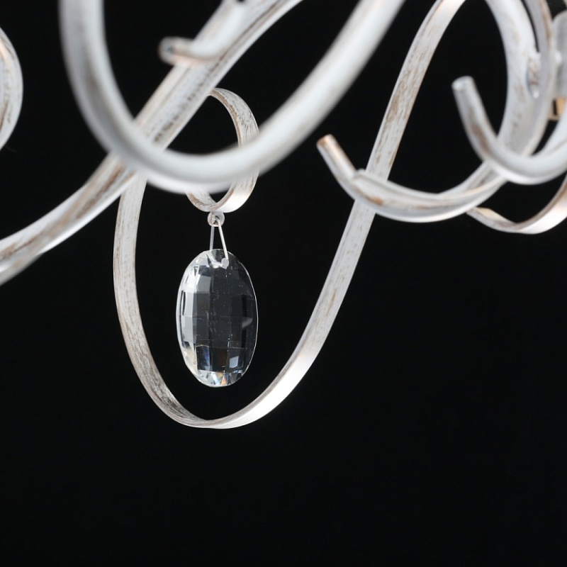 Основание светильника выполнено из металла и обработано по технологии двойного окрашивания, где основной слой золотого цвета, а декоративный - белого цвета. Декоративные розетки гальванизированы в цвет золота. Светильник декорирован прозрачным хрусталем формы овал, октагон и шар.