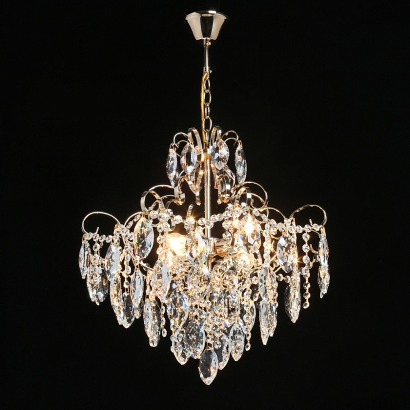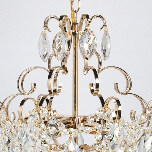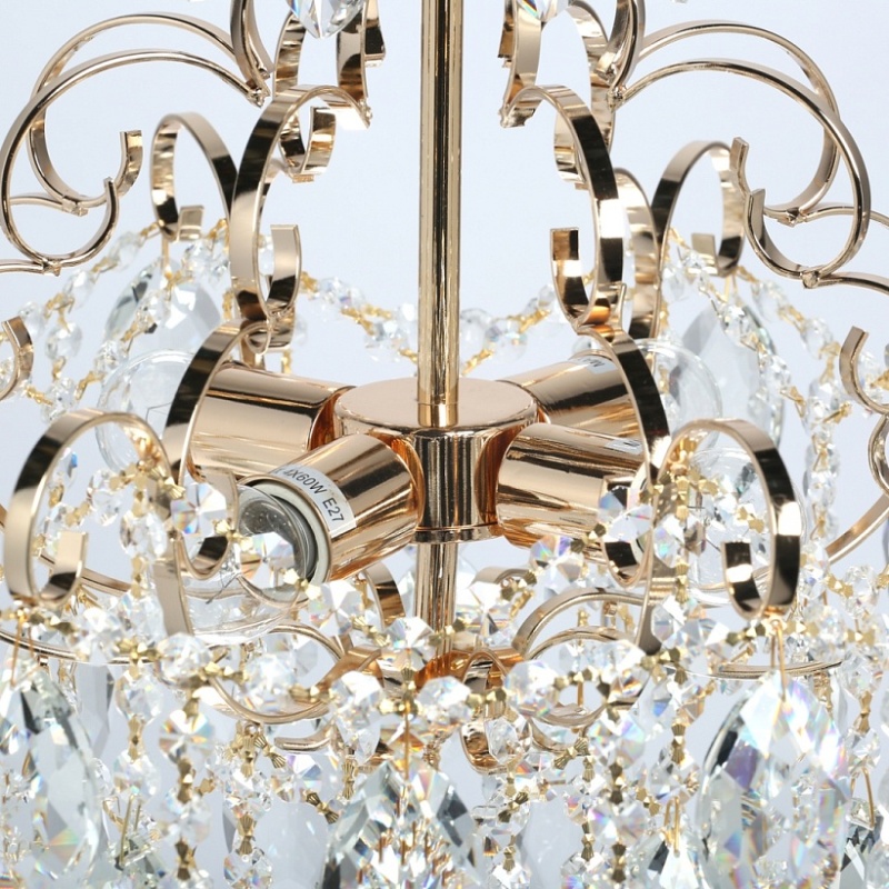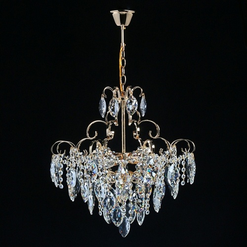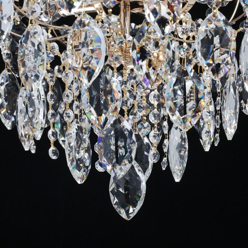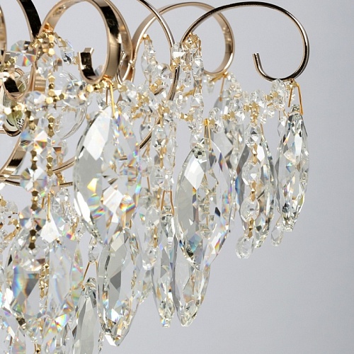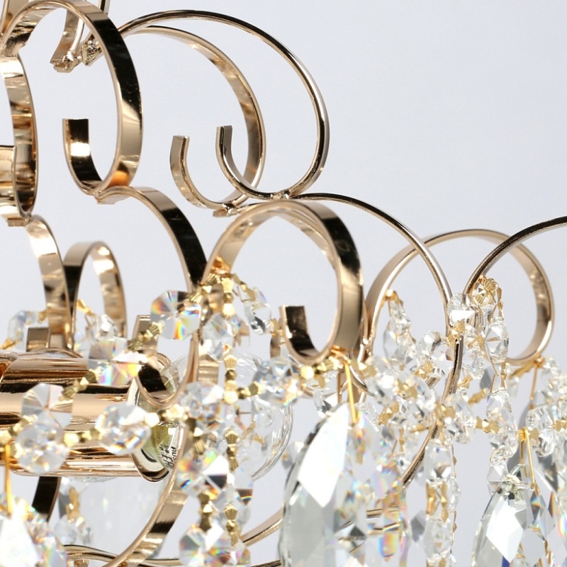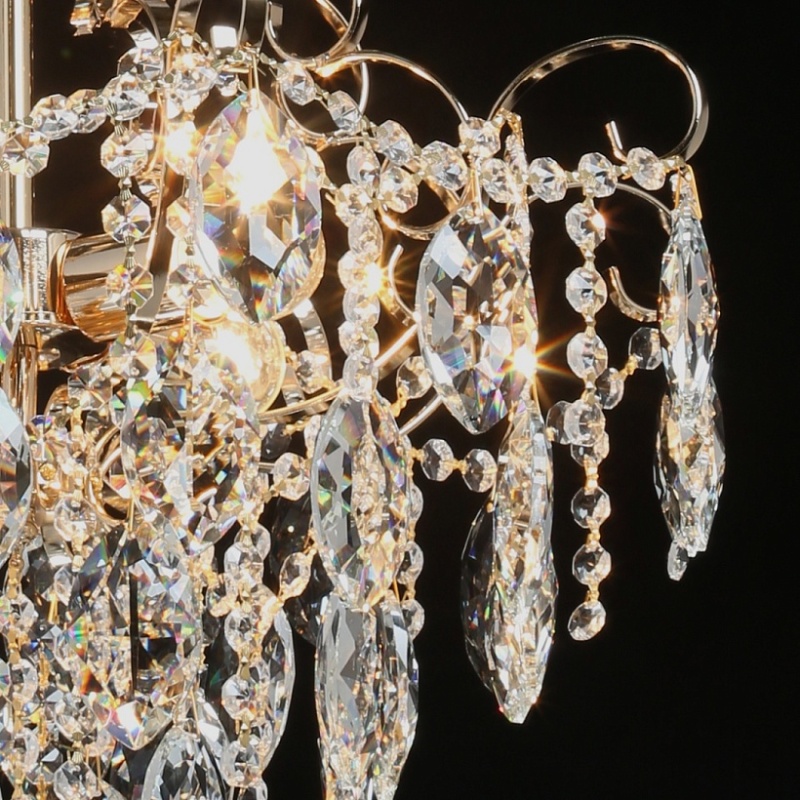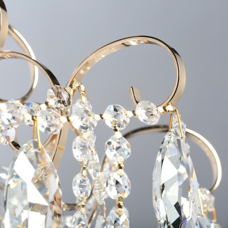 Основание светильника выполнено из сплава металла и гальванизировано в цвет золота. Светильник декорирован прозрачным хрусталем формы октагон и хрусталем оригинальной вытянутой овальной формы.