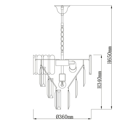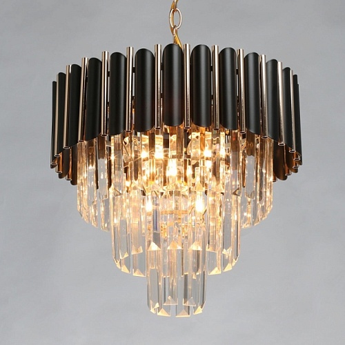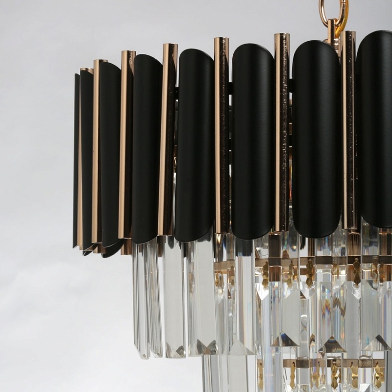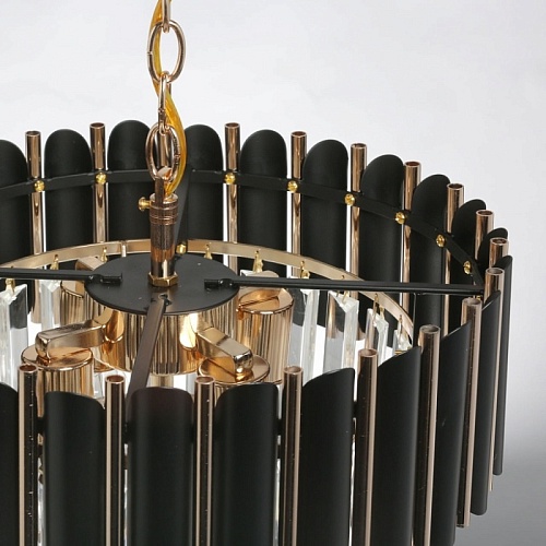 Металлическое основание светильника гальванизировано в цвет золота. Металлический плафон состоит из трубочек, окрашенных в черный цвет и гальванизированных в цвет золота. Светильник декорирован хрусталем прямоугольной формы