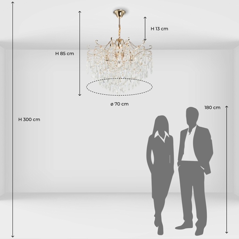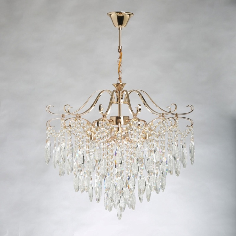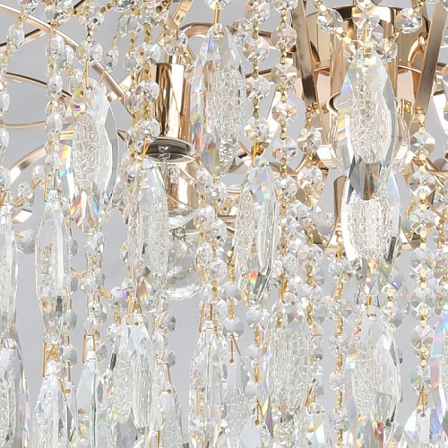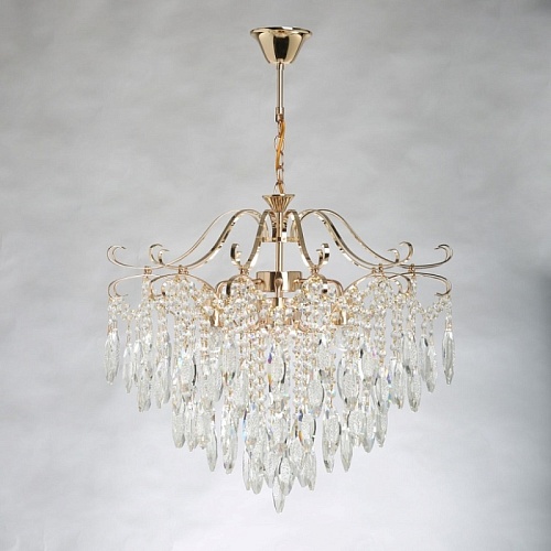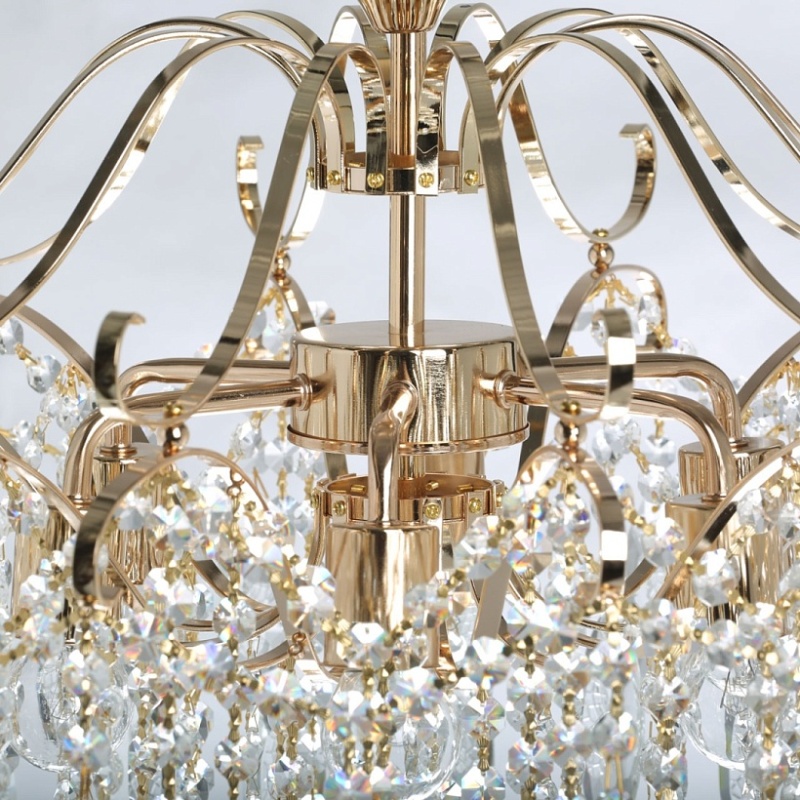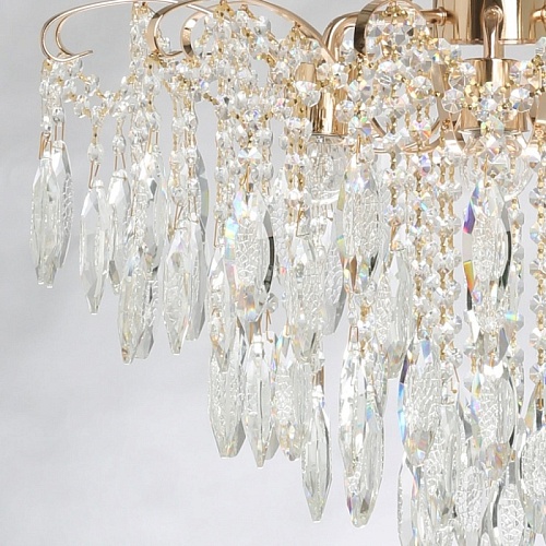 Металлическое основание потолочного светильника выполнено из металл и гальванизировано в золотой цвет. Светильник декорирован подвесками из фактурного прозрачного хрусталя в форме октагон и око.