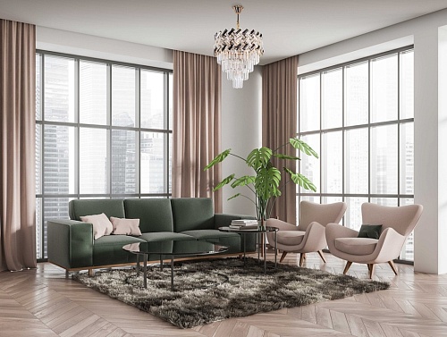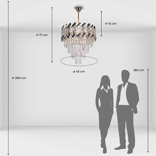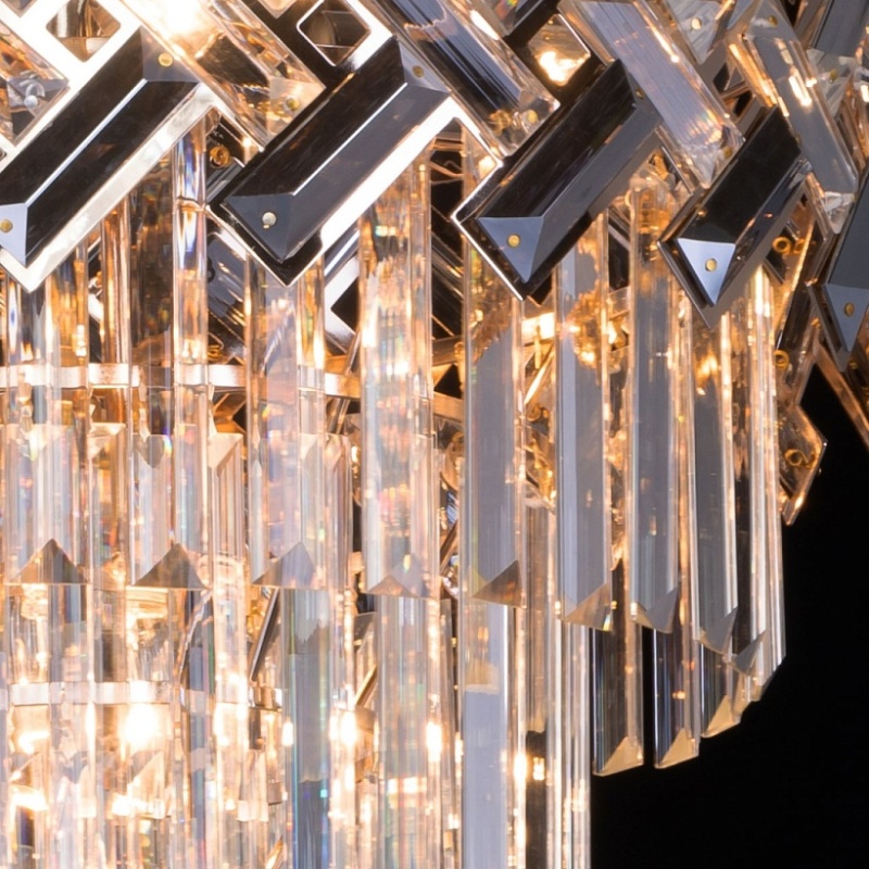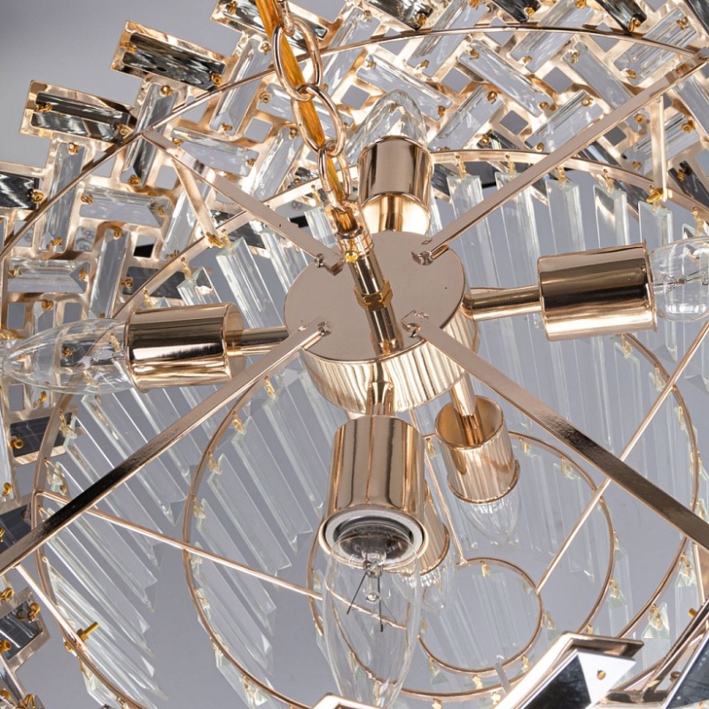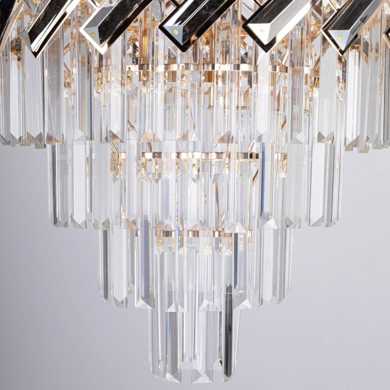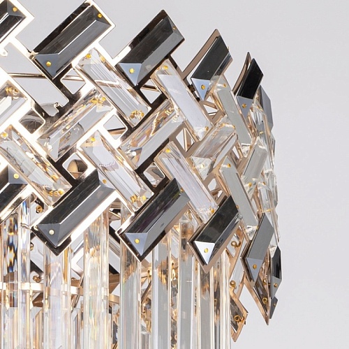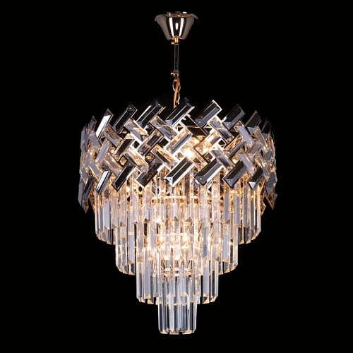 Металлическое основание светильника гальванизировано в цвет золота. Подвесная люстра декорирована прозрачным и гальванизированным в дымчатый цвет хрусталем.