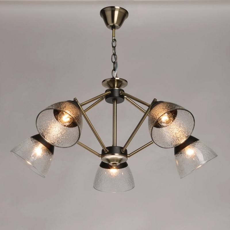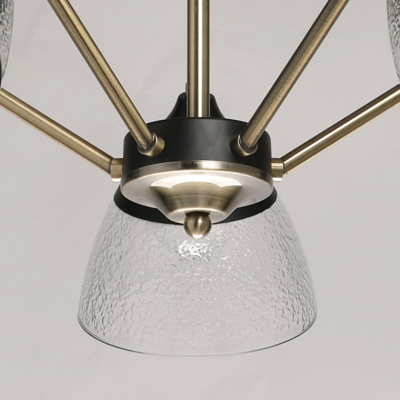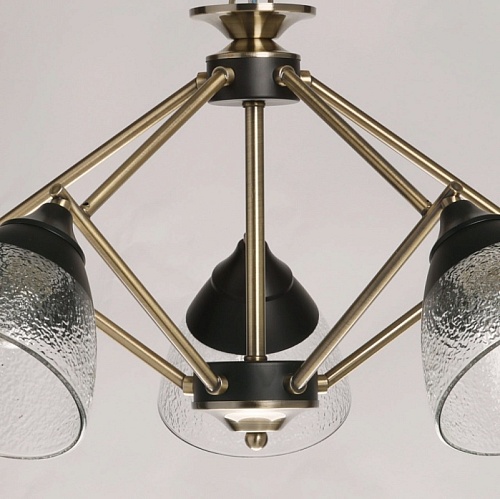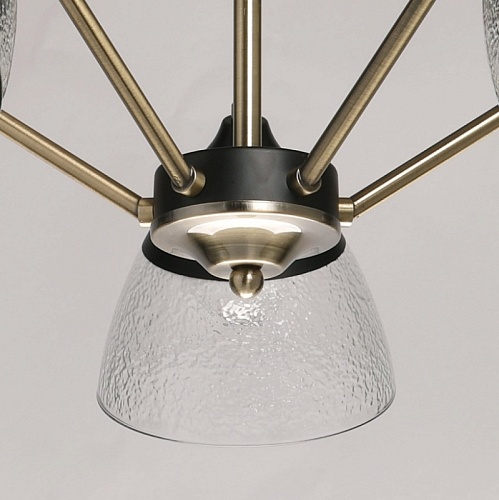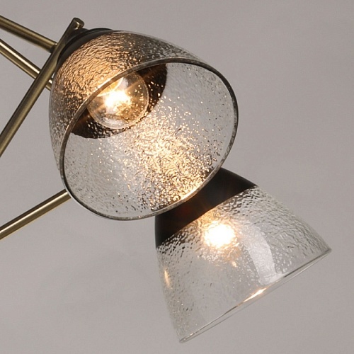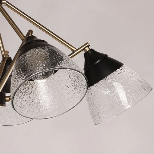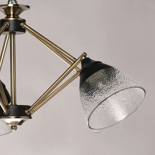 Металлическое основание подвесной люстры гальванизировано в цвет латуни. Отдельные элементы основания окрашены в черный цвет. Плафоны отлиты из прозрачного фактурного стекла. У основания плафоны окрашены в черный цвет.
